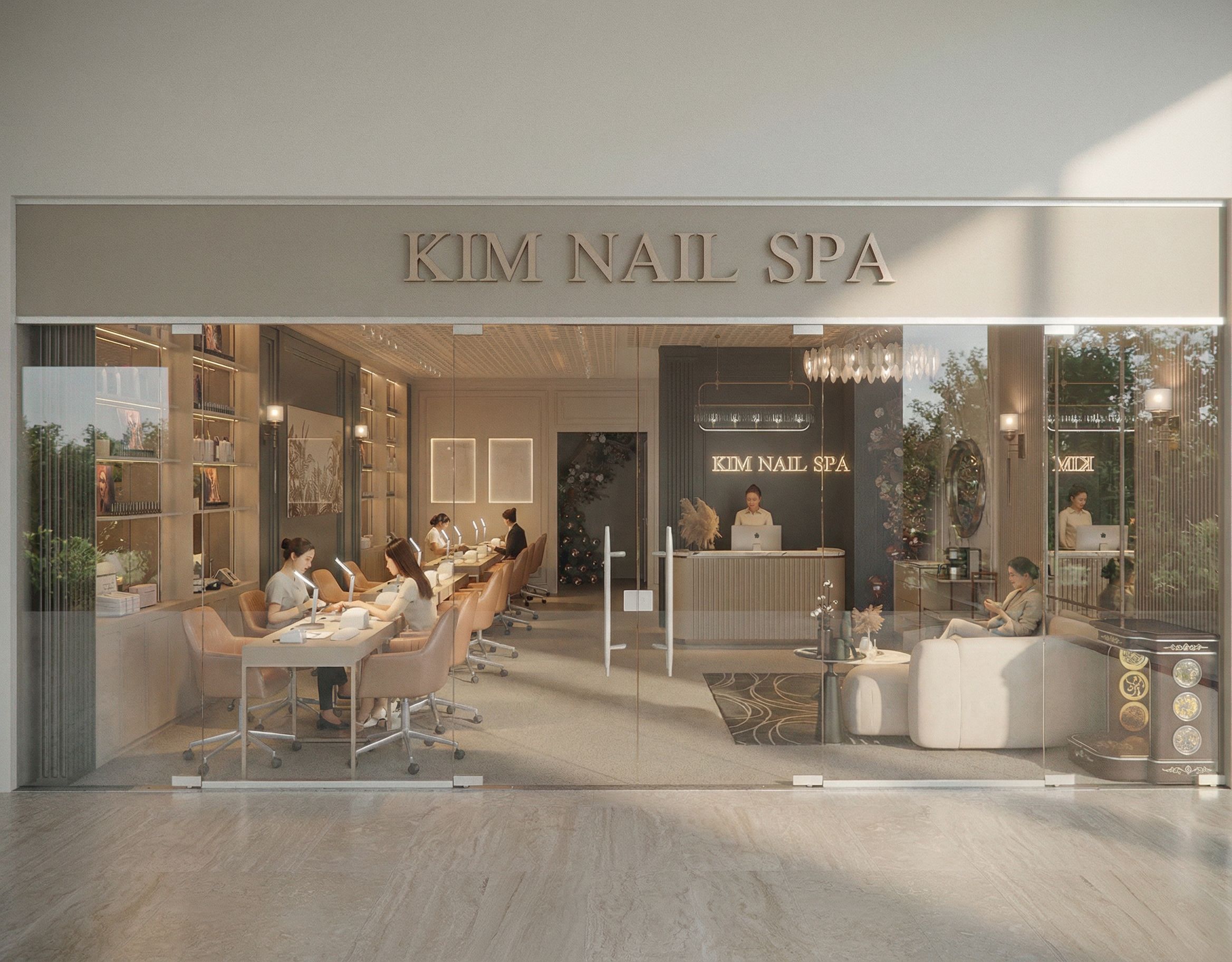 PromptThis photograph captures the interior of a modern salon, showcasing subtle architectural elements such as patterned ceilings and minimalist furnishings. The space utilizes soft, neutral tones, comfortable seating, and polished surfaces, complemented by lush greenery visible through large glass windows. Natural light floods the interior, creating gentle shadows and subtle accents. Shot from a wide angle, the composition emphasizes the open space and elegant design features, inviting viewers into a tranquil environment. The camera angle is maintained, preserving the architectural proportions and forms, as well as retaining the original materials, highlighting and depicting the textures as realistically as possible., keep exact camera angle