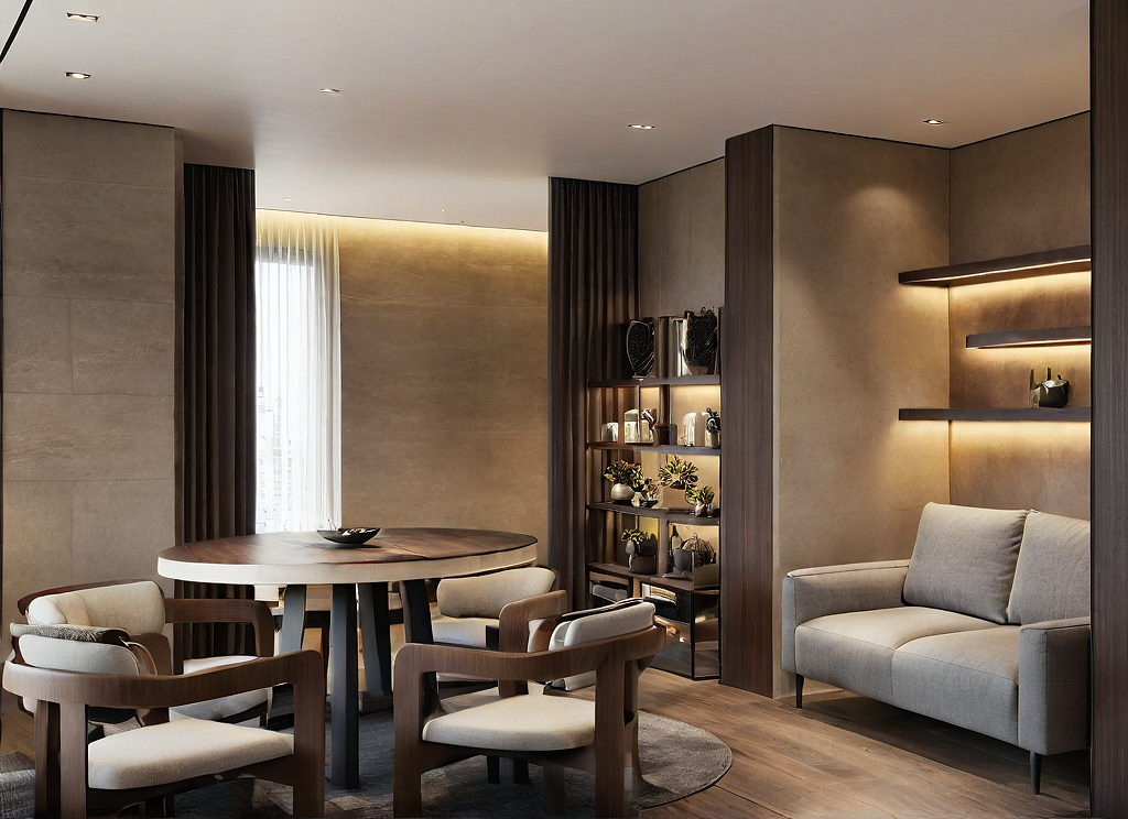PromptClasic, modern space, dark brown stone floor, beige walls, black shelves, grey sofa. brown wood round table, white, chairs, black little auxiliar table, light beige carpet, comfy space, expensive space