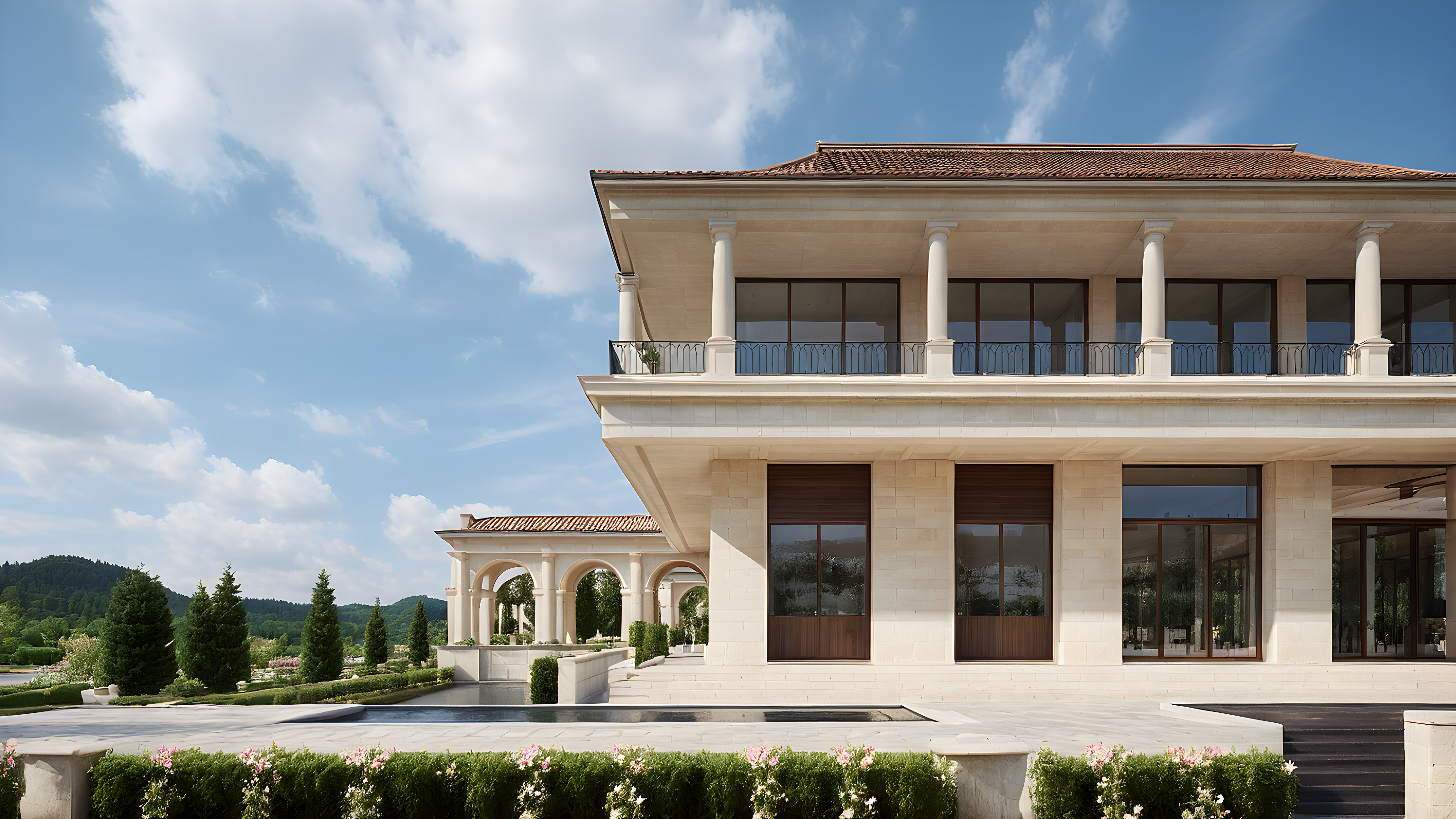 PromptSmooth Beige Limestone, Italian style brown tile roof, arches, columns, fountain, pond, manicured lawn, trees, asphalt driveway, lake, blossom flowers, Sunny summer, Bright day, Blue sky, Forest environment, mountain view, more dense big trees, grass lawn on terrace