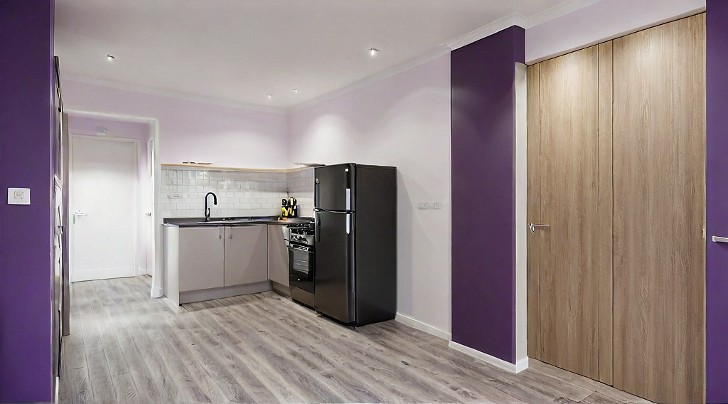 PromptThis is a shared kitchen in a student accommodation unit. Paint the purple walls grey and the white wall in the passage to be purple.