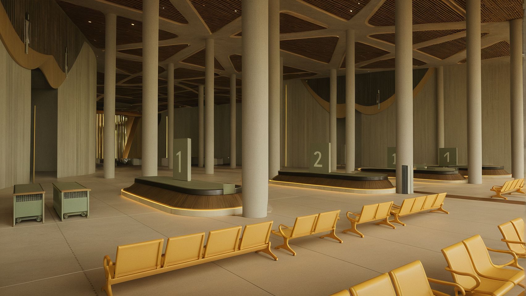 Promptstyle transform, interior perspective shot, modern arrival airport terminal , baggage claim area with baggage belts , baggage trolleys, high ceiling, 3d acoustic concrete with metal panels ceiling, round concrete columns, curved wall with wood strips design, waiting area, 60% olives greens 30% soft whites 10% soft yellows color palette, afternoon mode, soft interior lighting, high quality materials textures, realistic render