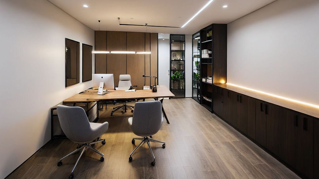 Design an office for me in a modern style, add lighting for me.
