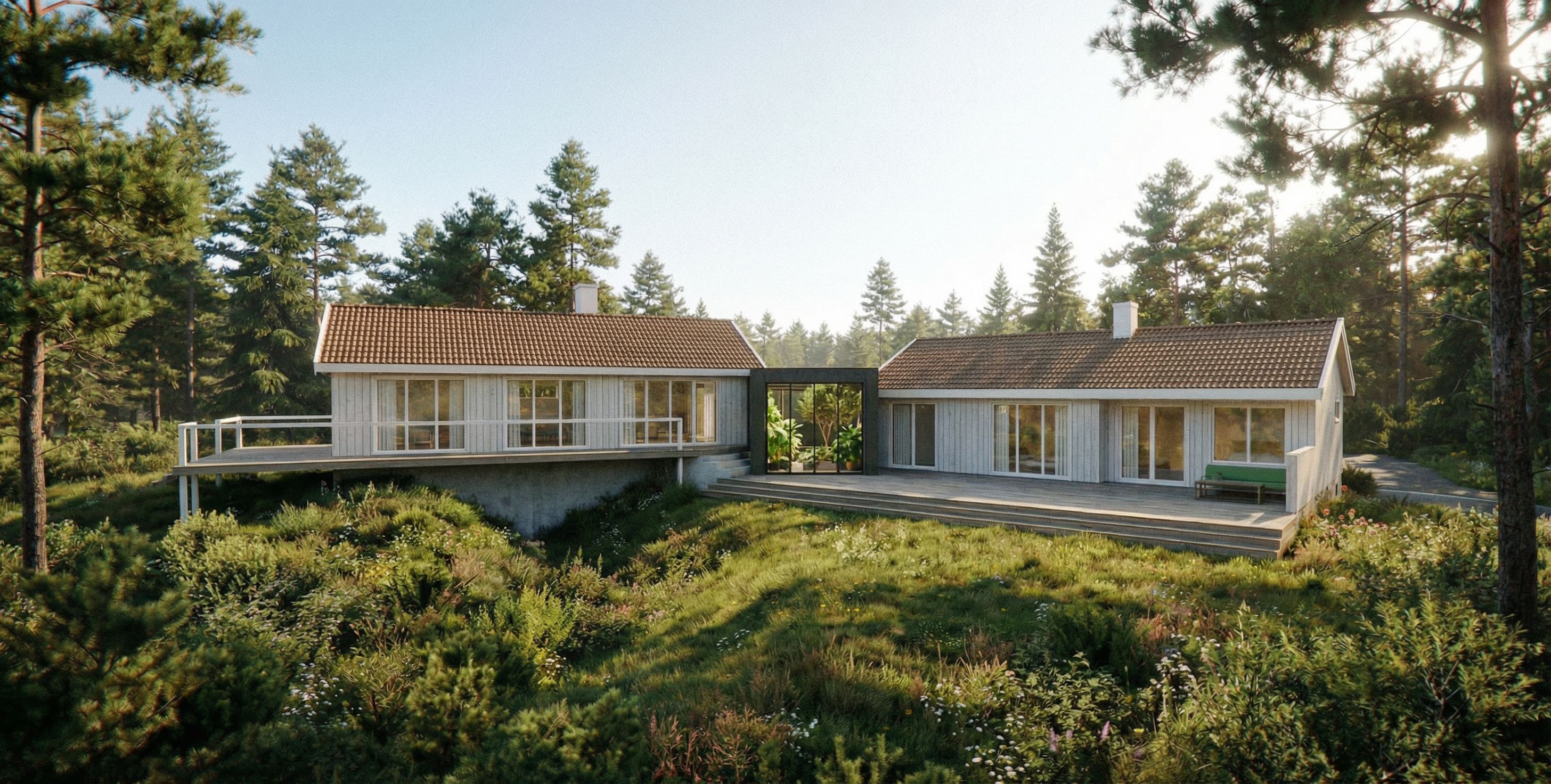 Create two natural houses in white natural panel. With a modern connecting building in between with flat roof that has a contrast to the the building on the left and right side. Plants inside middle building. The green house should be in steel. Natural environment with some pine trees. Red roof tiles. , keep exact camera angle