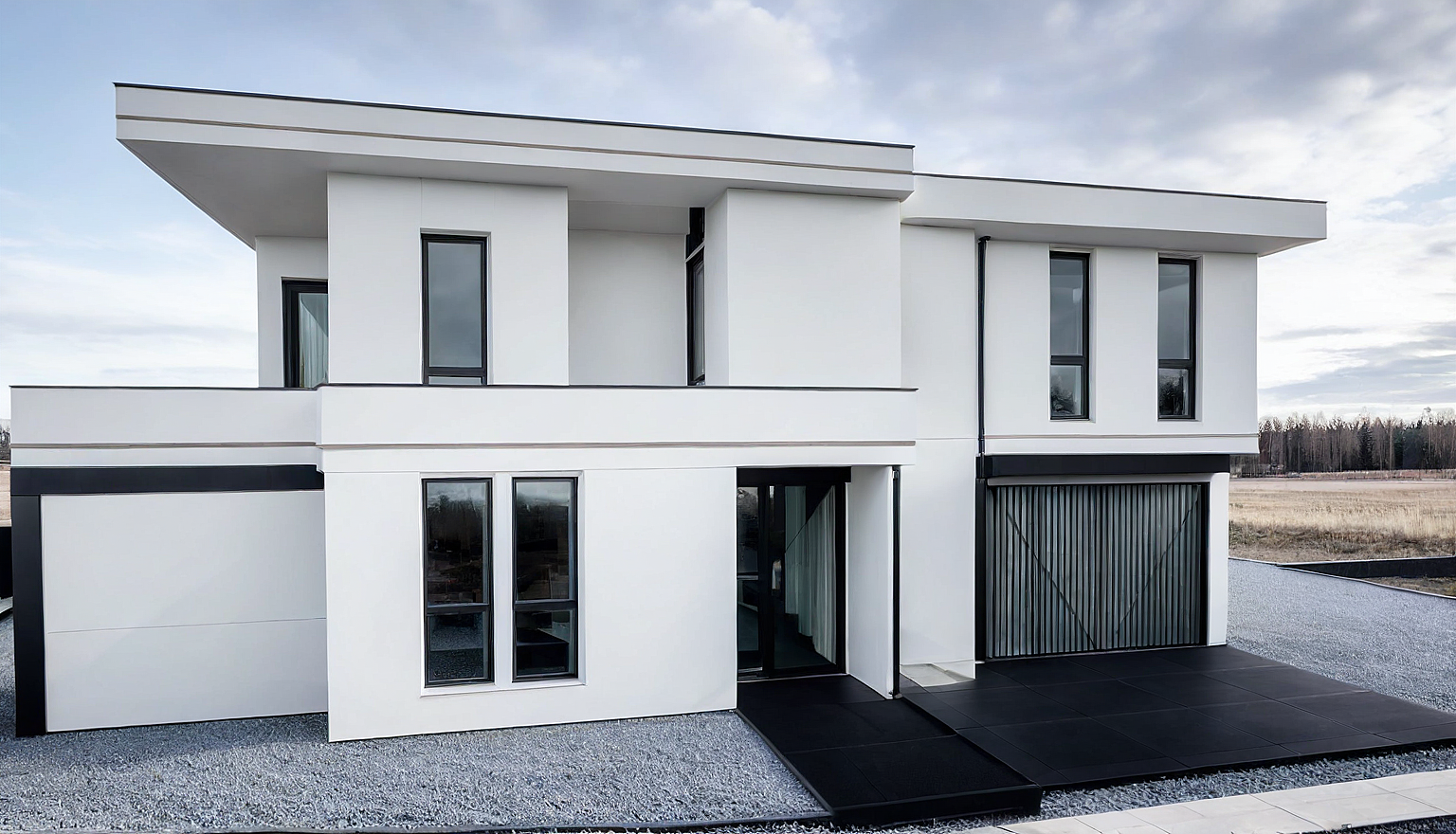 Promptmodern facade, white, and brown colors of abricht, i want to have also stone bricks and black metal details, and black metal frames of windows