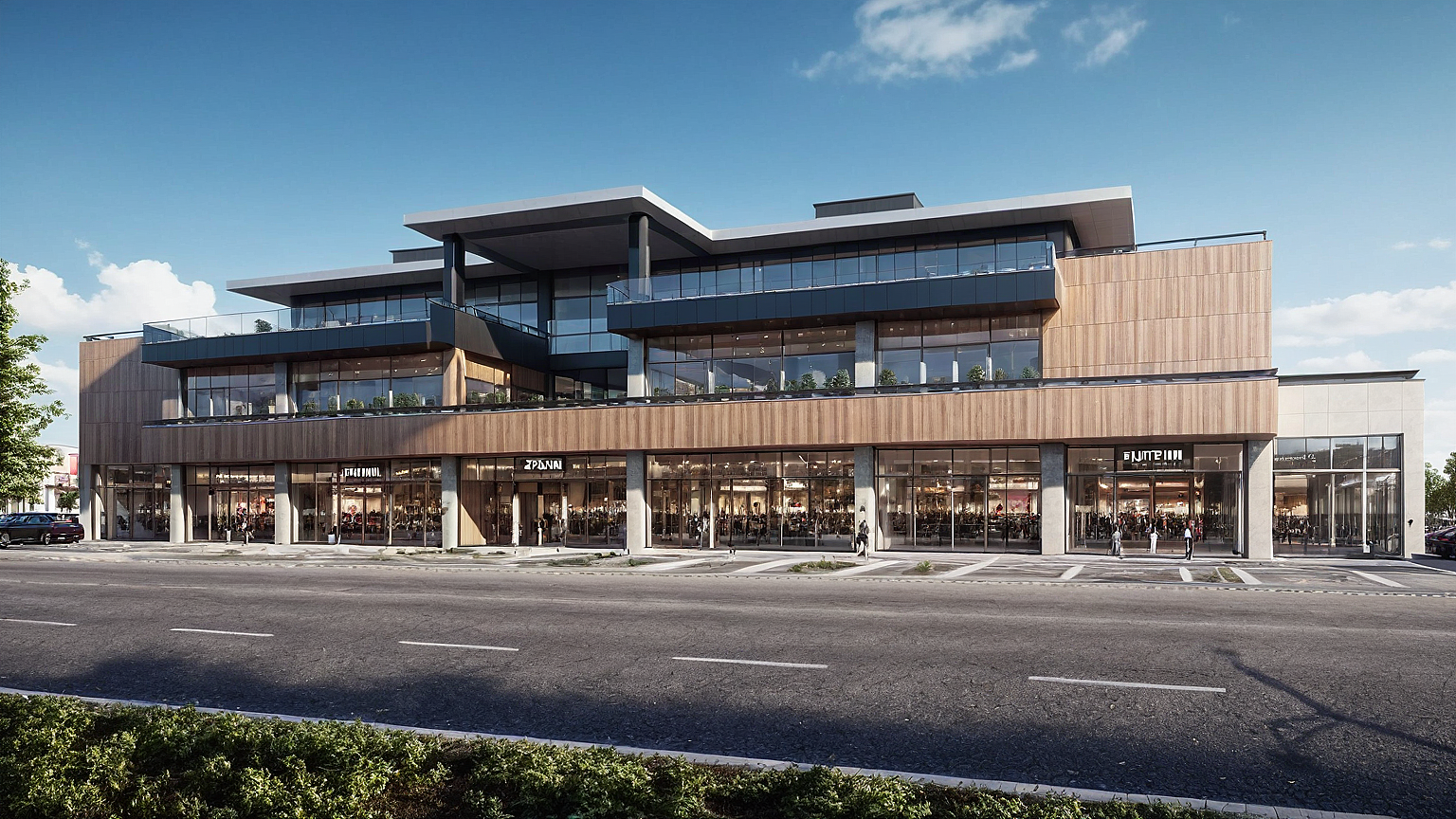 Promptshopping mall, cars, trees, people, realistic rendering, modern facade, realistic sky, parked cars, lighting on the facade, small trees in front of the building, people walking, cars passing by
