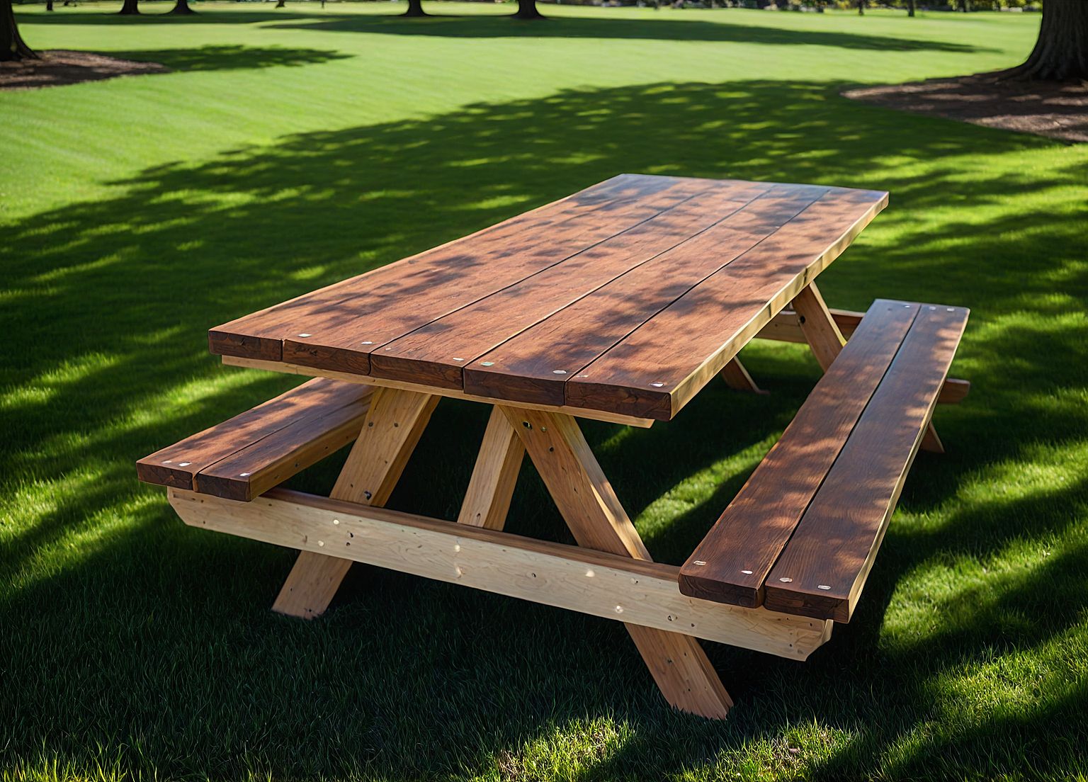 Photo of a picnic table designed for outdoor spaces, showcasing sturdy wooden planks with a rich brown finish and visible grain texture. Set against a natural backdrop, with nearby green grass and trees providing a contrast. Soft dappled sunlight filters through the leaves, creating playful shadows and highlights on the table's surface. A low-angle perspective captures the intricate joinery and craftsmanship, with a wide lens that emphasizes the table's inviting form and its integration with the serene surroundings.