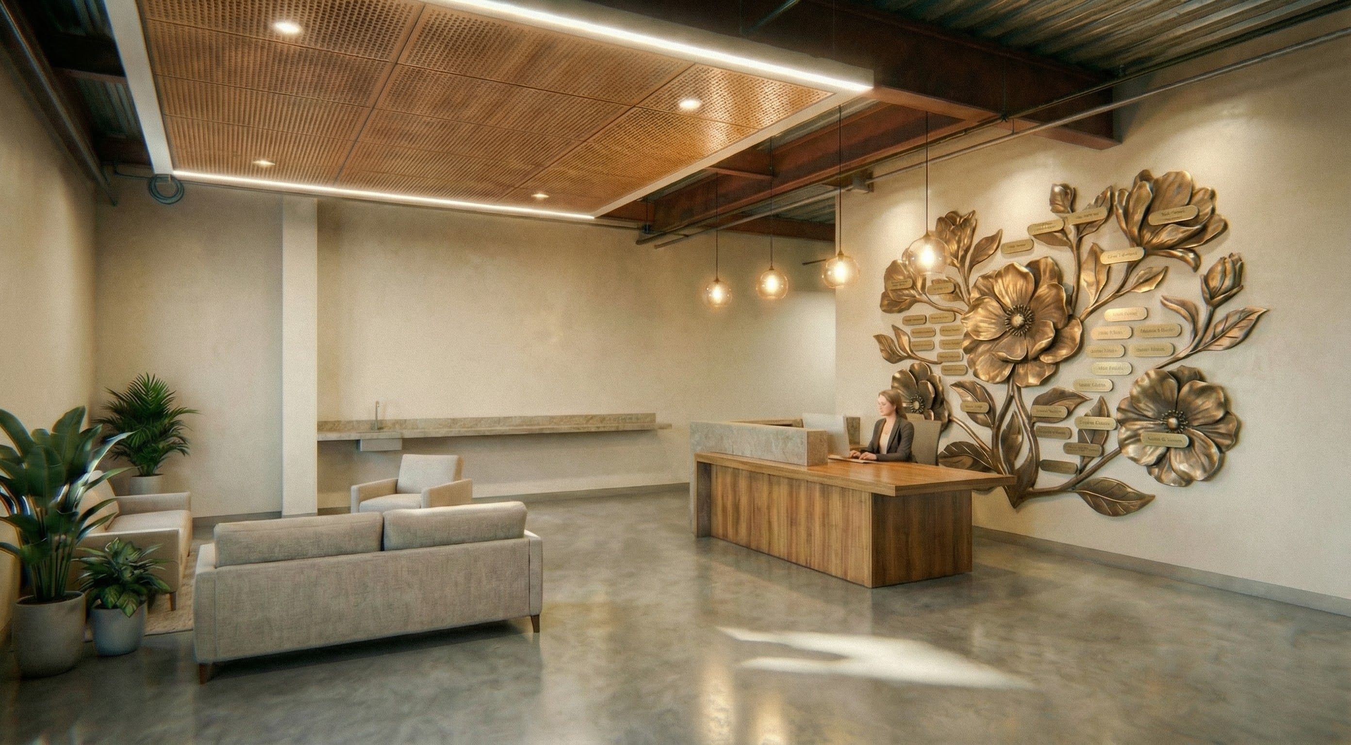 Promptput the donor wall design behind the reception area instead, could you try something with flowers? some type of 3d plaque for the donors , keep exact camera angle