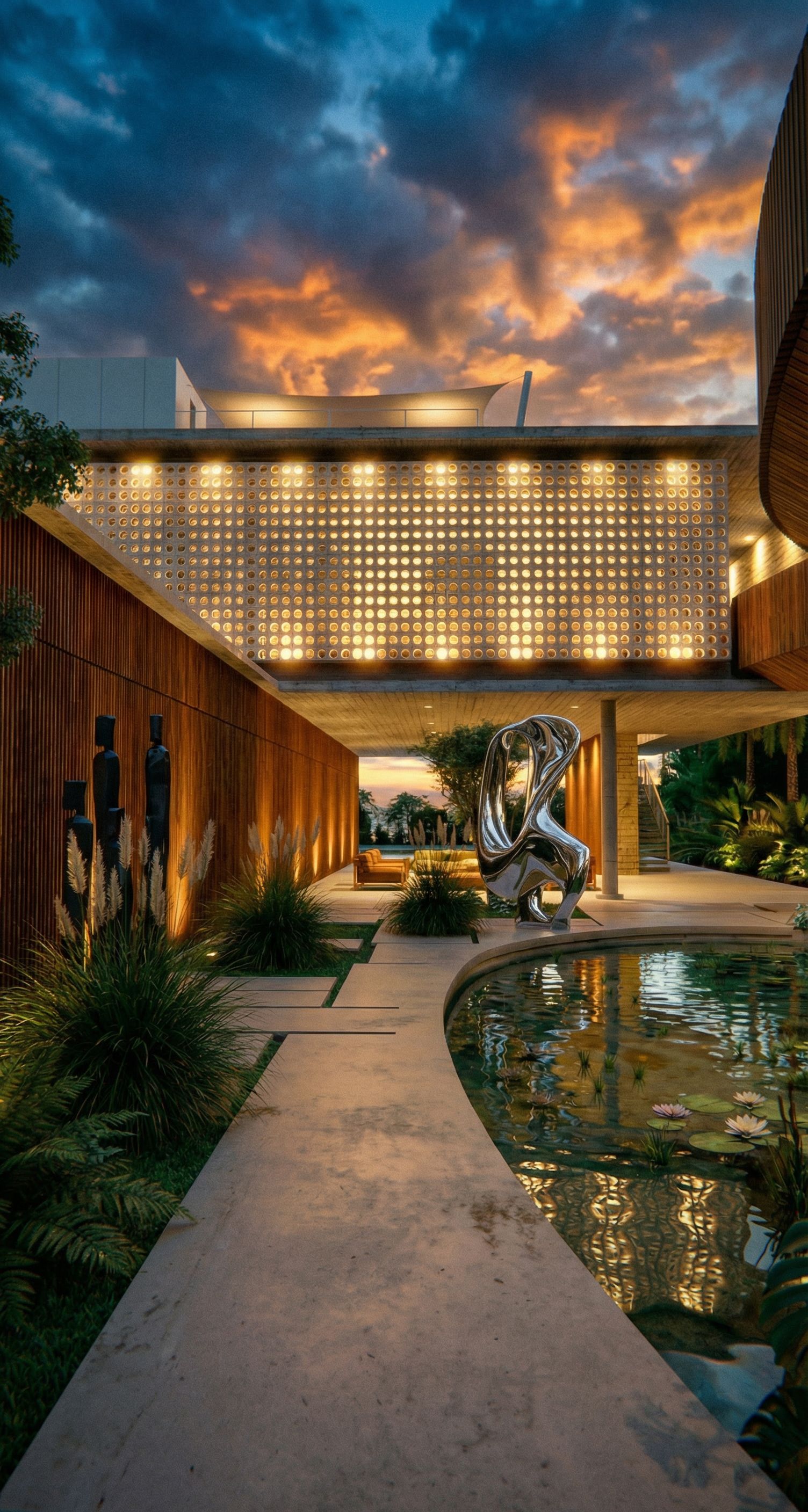 Promptconserva la imagen en el mismo formato que está y conserva los cielos, luces y texturas. añade las esculturas oscuras de las imágenes de referencia a la izquierda entre las plantas Añade la escultura cromada entre la piscina y las escaleras, keep exact camera angle