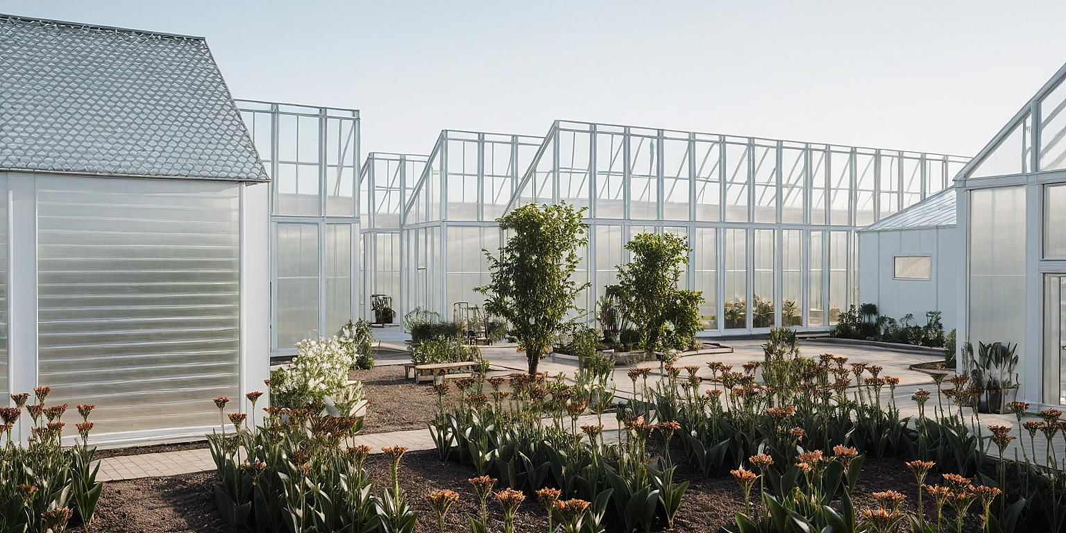 PromptMake the greenhouses white with white no see through glass. Inside the greenhouses are flowers. People are also sitting on the benches and walking. there are a lot of types of flowers. the other houses are light brown.