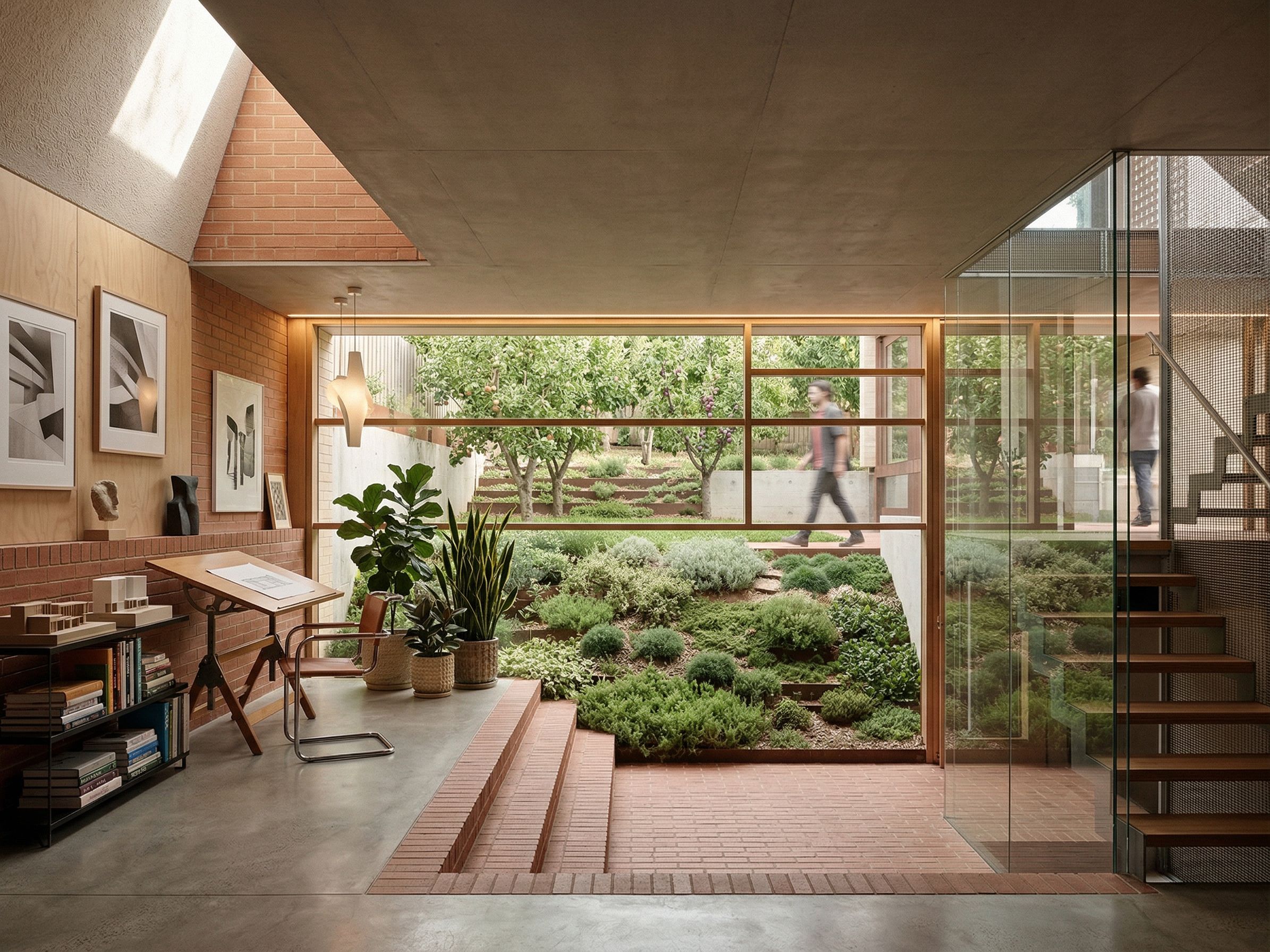 interior of a lower studio looking outside into a small orchard with a foreground sunken patio with a landscaped edge. Use existing view angle., keep exact camera angle