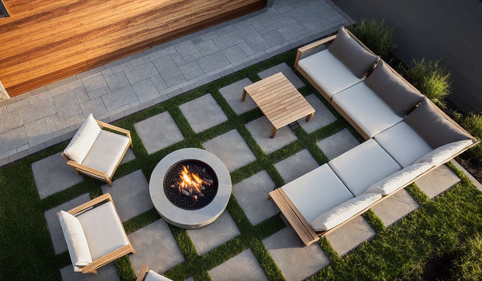 Photo of a contemporary outdoor living space featuring a modern seating arrangement around a circular fire pit. Focused on the architectural details, materials include sleek concrete, wooden accents, and soft fabric cushions. The urban setting showcases manicured grass and geometric stone pathways. Natural daylight casts gentle shadows, highlighting the textures. Aerial perspective with a high-angle view emphasizes the layout, focusing on the blend of comfort and style in a cozy outdoor environment.