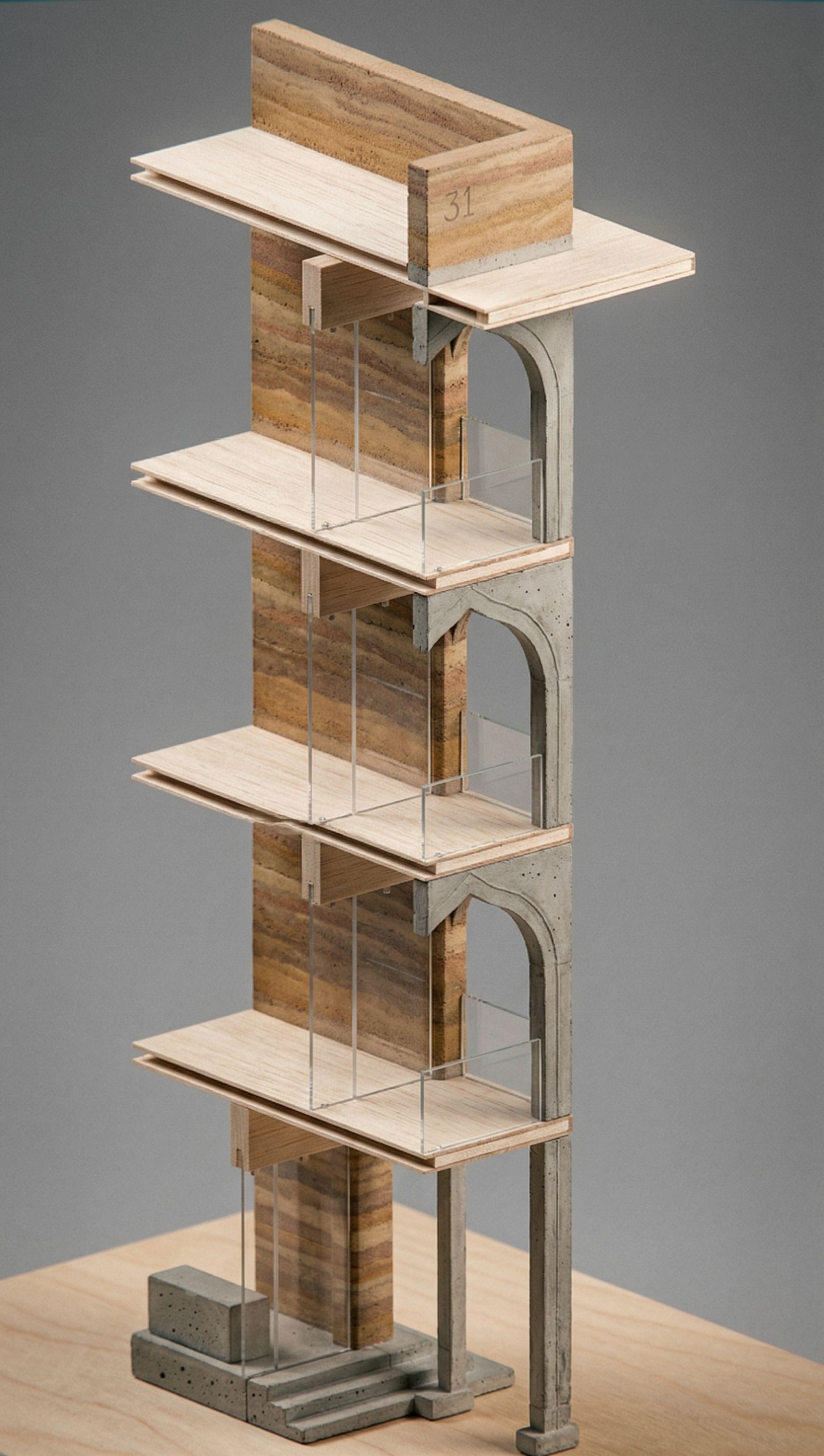 PromptConvert as a realistic hand made architectural model of a building section, made out of rammed earth, balsa wood, concrete. set on a model plinth, in a empty photo studio setting., keep exact camera angle