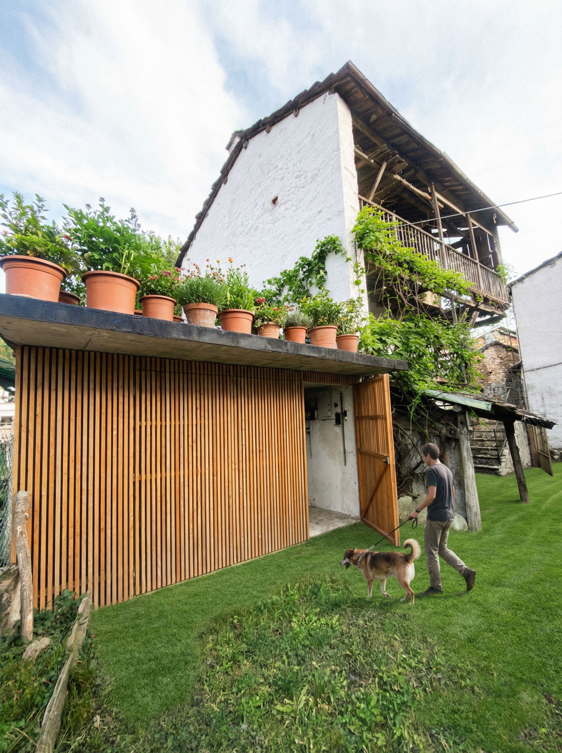PromptPer il mascheramento della facciata basso fabbricato Inserire listelli di legno verticali posizionati a filo con possibilità di aprire portone . Sopra il basso fabbricato mettere vasi di terracotta con piante . Prato davantoi edifici curato . Inserire persone con cane , keep exact camera angle