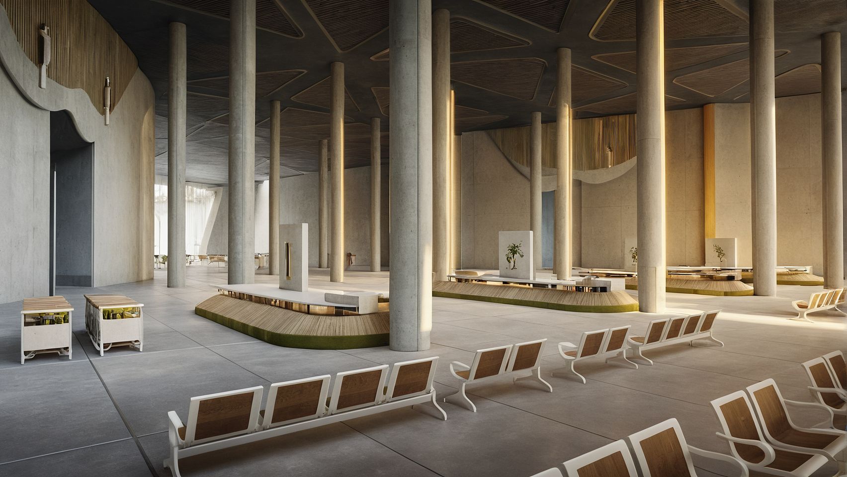 interior perspective shot, modern arrival airport terminal , baggage claim area with baggage belts , high ceiling, 3d acoustic concrete with metal ceiling, round concrete columns, curved wall with wood strips design, waiting area, 60% olives greens 30% soft whites 10% soft yellows color palette, afternoon mode, soft interior lighting, high quality materials textures, realistic render