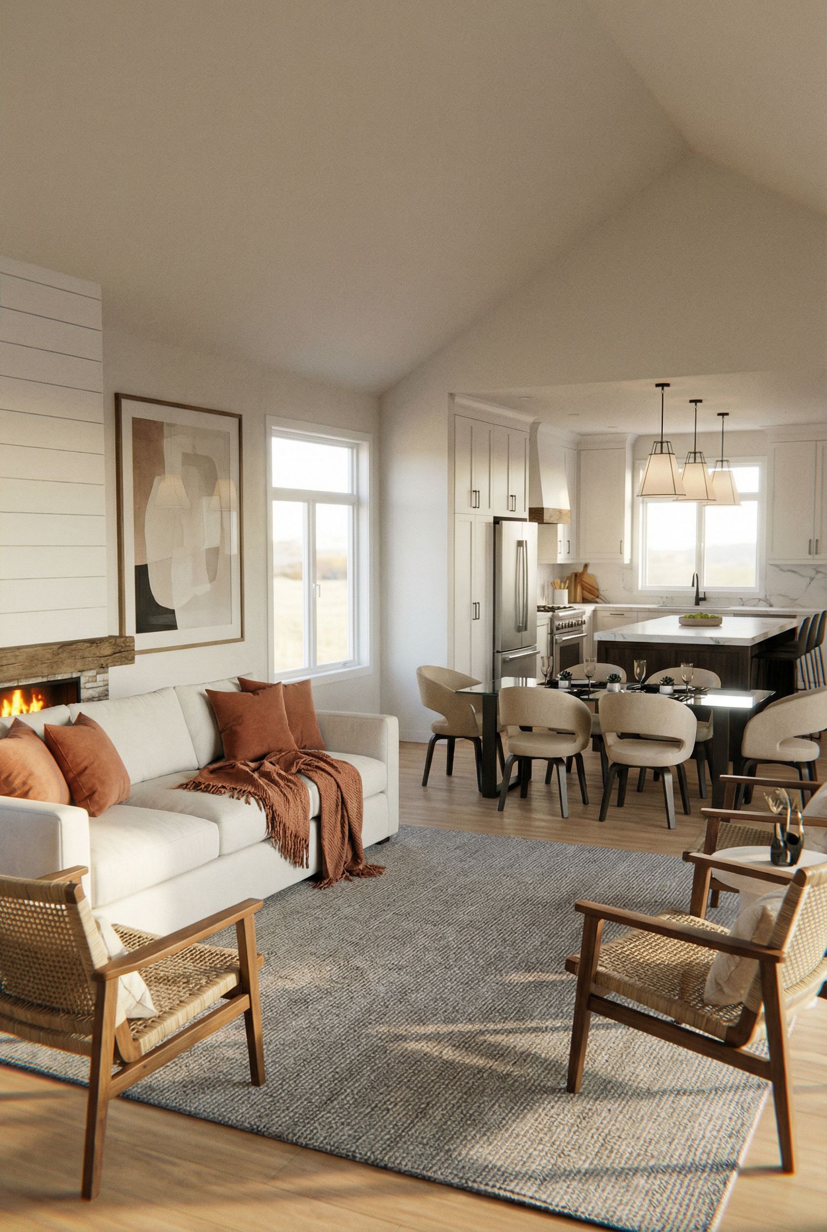 PromptWhite side window, smaller shiplap fire place with a barn beam mantle, white couch with terracotta pillows and throw blanket, two wood frame arm chairs on either side of the fireplace, large art work behind the couch, pendant lights over the island like reference photo 2, keep exact camera angle