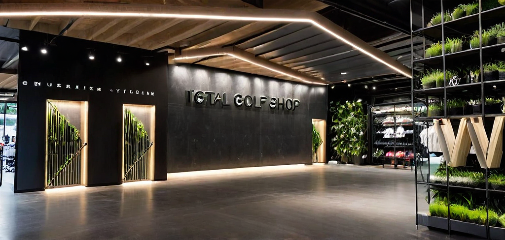 masculine Industrial feel. golf shop. dark profiled metal cladding to roof. exposed Concrete floor. inside plants over reinforcing mesh. beams colored Zinc. birch plywood lowered ceiling. feature lighting hanging from the roof.