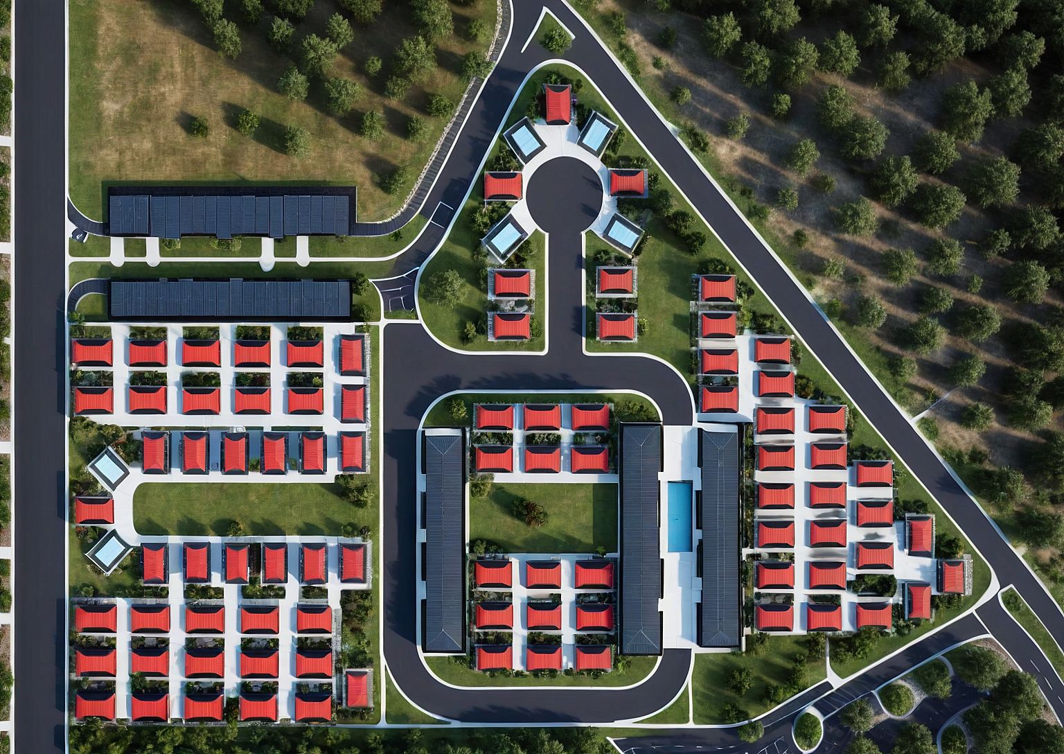 PromptRender this image as a realistic site plan. The red boxes are the tiny homes, make them have black roofs. I want grass under all of the homes. The light blue is all roads.
