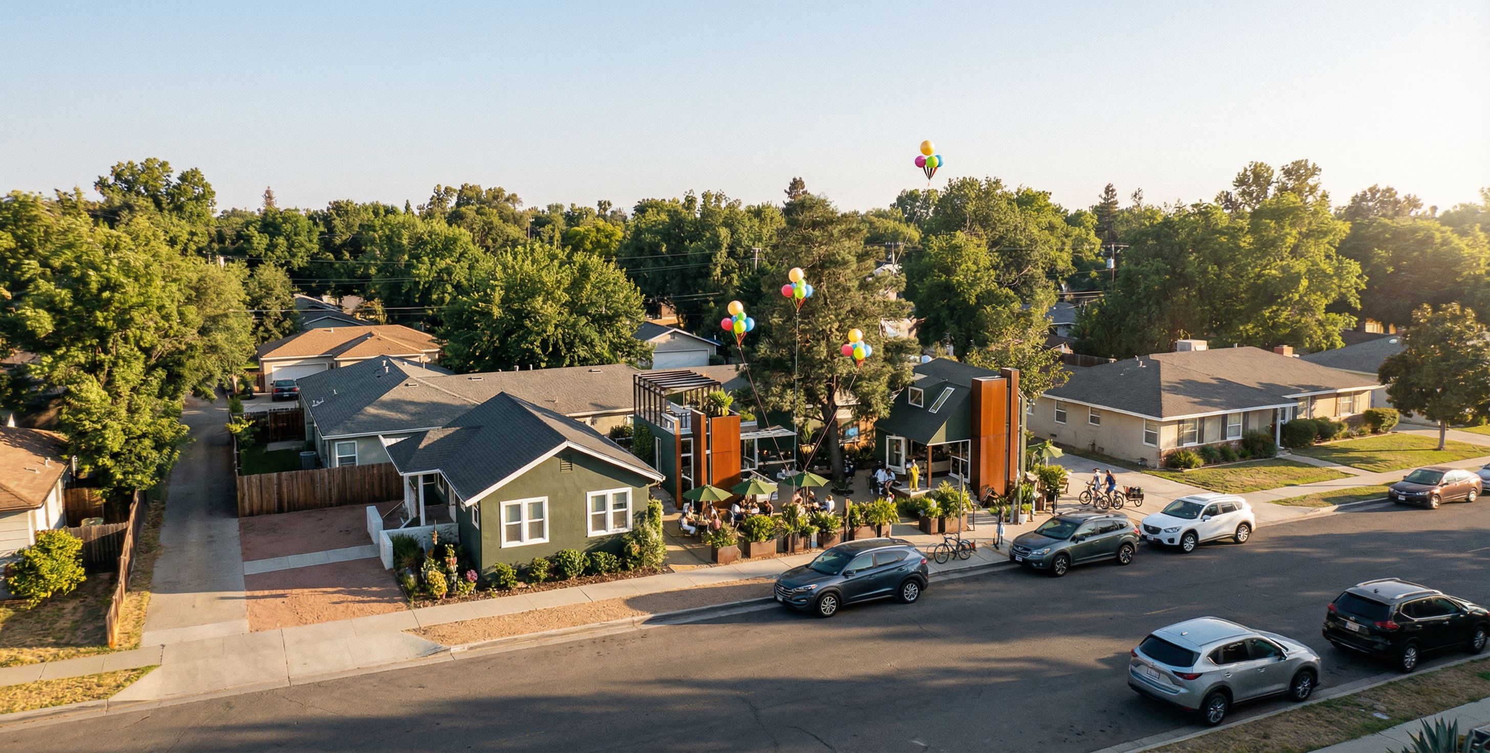 modern, smooth rusted steel vertical walls, dark green stucco walls, white window frames with trees in background and single storey low bungalows in back same viewpoint, keep exact camera angle