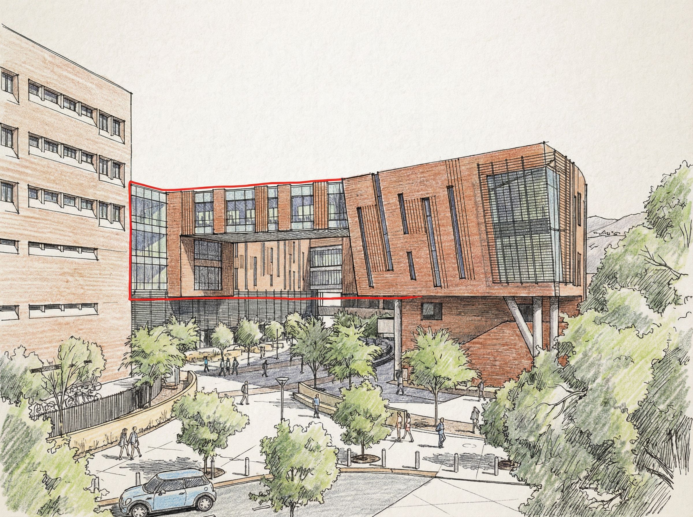architectural exterior rendering, render this photo into hand-drawn architectural sketch, Keeping the background the same create a building addition inside the red sketch that matched the building style, keep exact camera angle, high quality, professional, detailed scene