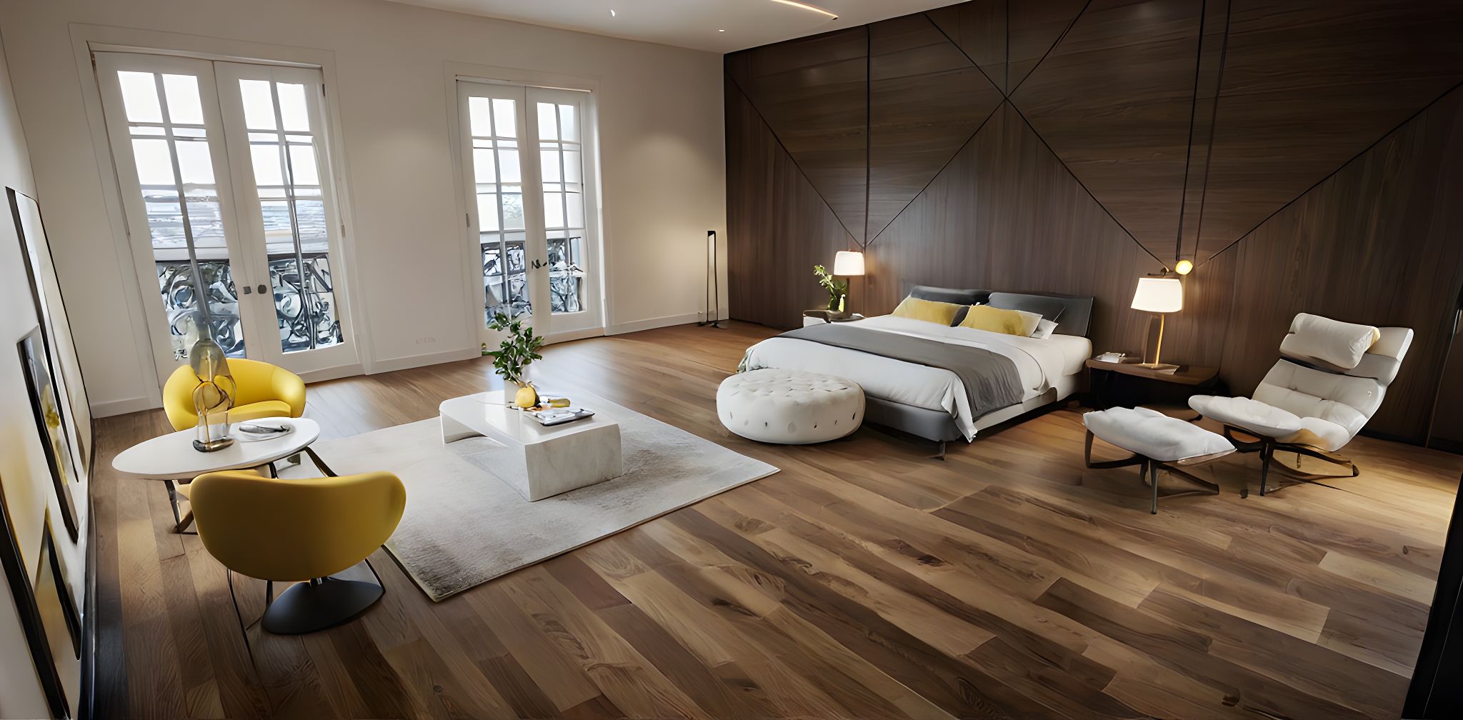 PromptPhoto of a modern interior living space featuring a minimalist bedroom and seating area. Highlight sleek white bedding, stylish yellow accent chairs, and smooth wooden floors. The room’s large windows invite natural light, creating soft shadows across the space. Accentuate the elegant design of contemporary furniture pieces, including a unique coffee table and decorative elements. Capture a wide-angle view from a corner perspective, emphasizing spatial flow and harmony in the layout, while keeping focus on textures and details that enhance realism in this architectural visualization.