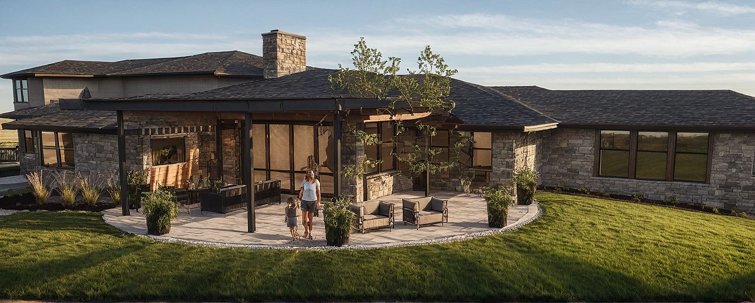 PromptHome with stone exterior Nebraska landscaping lighting in windows 5pm summer light