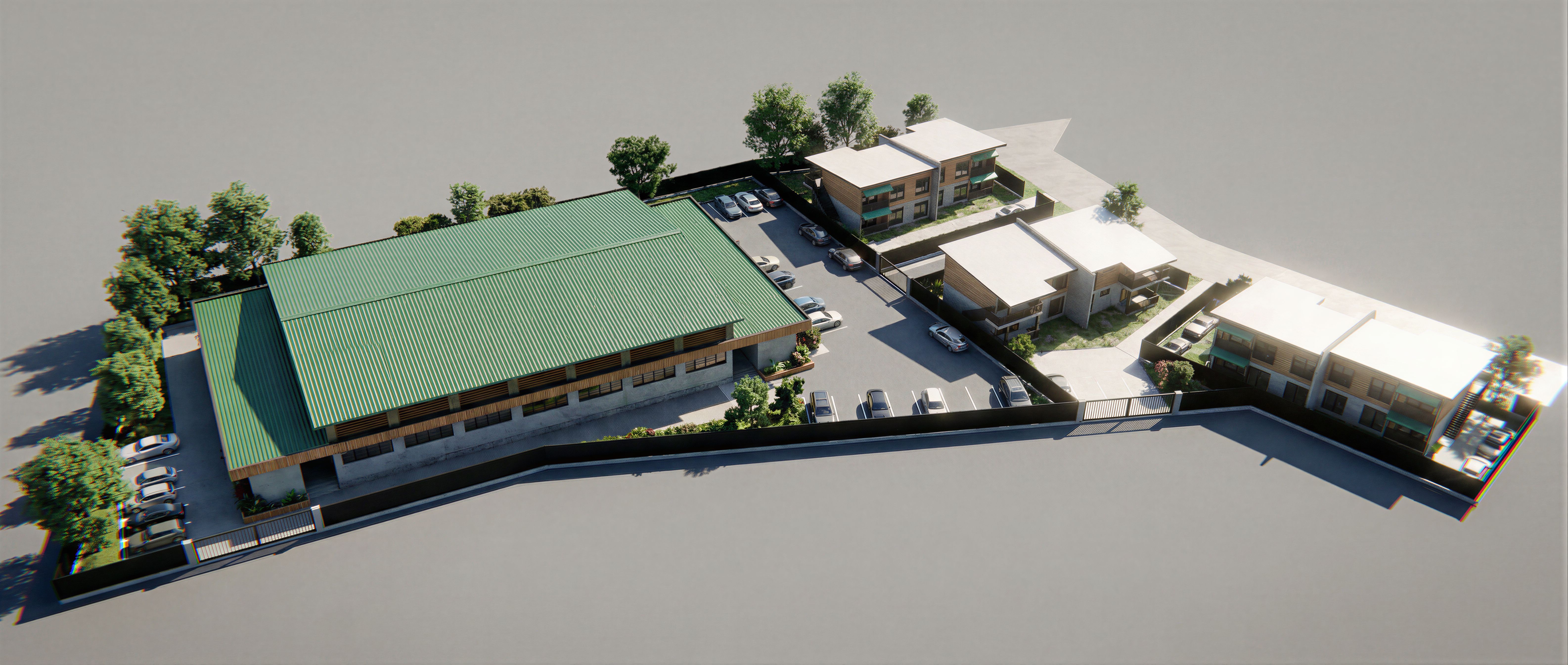 EnhancedPromptPlease render this master plan for me. Show only the elements included in the drawing and leave the blank spaces empty. Make the visualization more realistic by fitting in fence sliding gates. Kindly add cars and trees to the landscape. RENDER AS IT IS , keep exact camera angle
