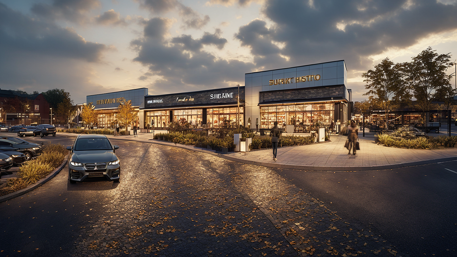 PromptModern retail facade featuring a new metal panel, metal canopy, painted brick, golden color store windows, bright ambiance, asphalt road, captured in the evening sky during the autumn season.