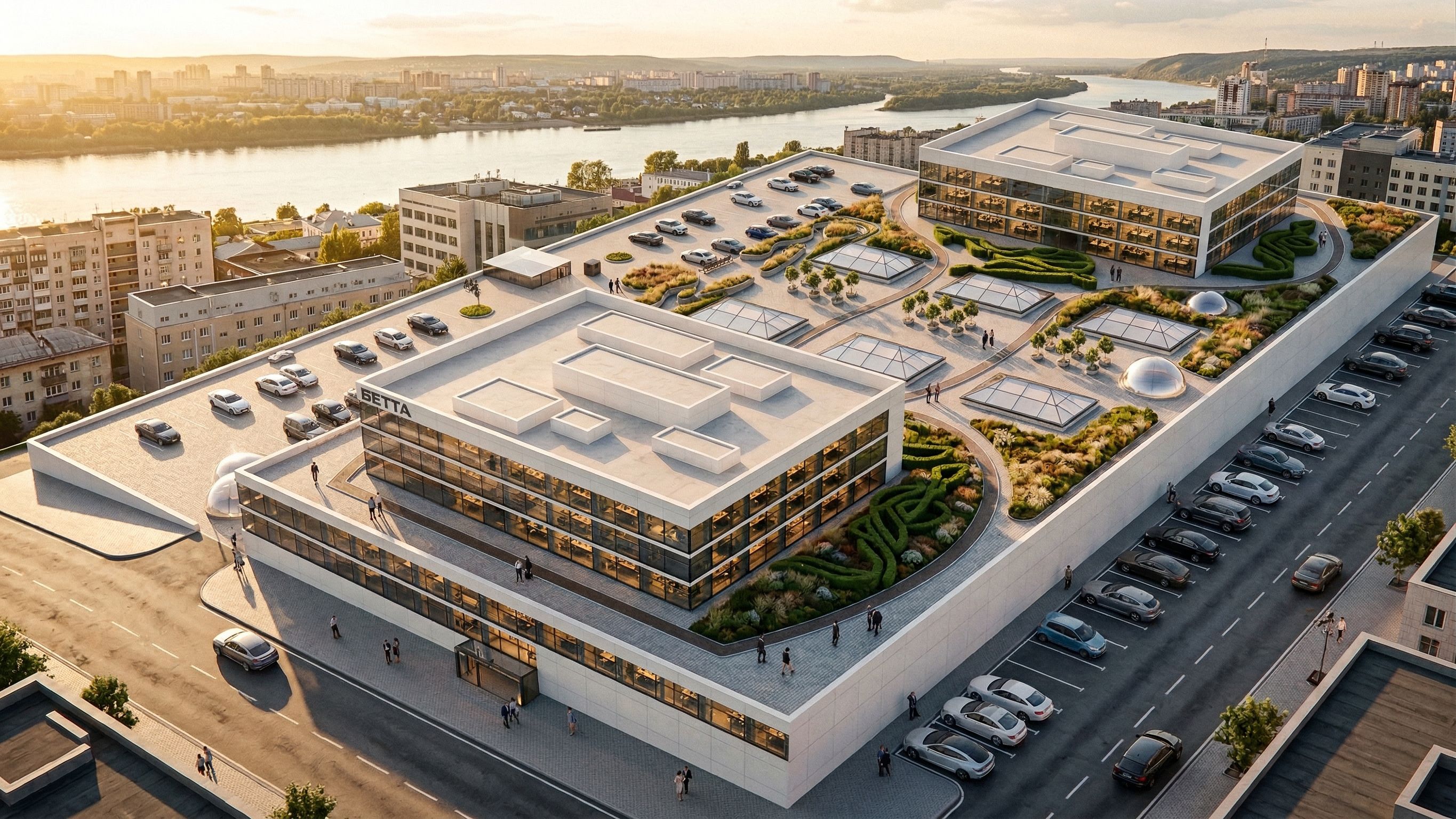 PromptA photograph of a modern industrial and office complex. The facade is finished with elegant tinted glass windows and white sandwich panels. The building is set in a landscaped area. The project includes a multi-level layout and green terraces. Tinted glass skylights on the roof allow light into the building. People leisurely walk to work. Business-class cars park in the open-air parking lot. Warm lighting during the "golden hour" casts soft shadows, enhancing the texture of the materials and highlighting the building's lines. The photograph was taken from above with a wide-angle lens, emphasizing the overall layout and integration with the surrounding environment. Maintain a precise camera angle., keep exact camera angle