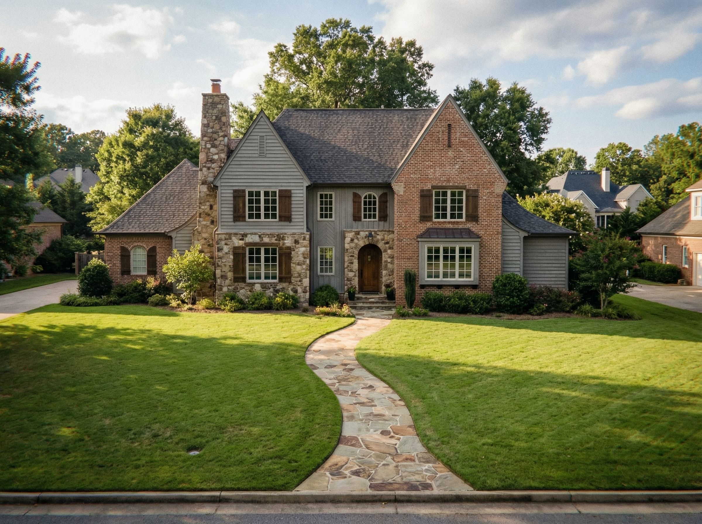 PromptPhoto of a charming residential home featuring a blend of brick, stone, siding, characterized by intricate architectural details such as gabled roofs and large windows. Surrounded by lush greenery and a well-manicured lawn, the scene captures a suburban setting with neighboring houses in the background. Soft afternoon sunlight bathes the façade, casting gentle shadows that highlight textures. Shot from a straight-on angle, using a wide-angle lens to encompass the home's inviting entrance while maintaining a clear view of the surrounding environment. Keep true to the original sketch., keep exact camera angle