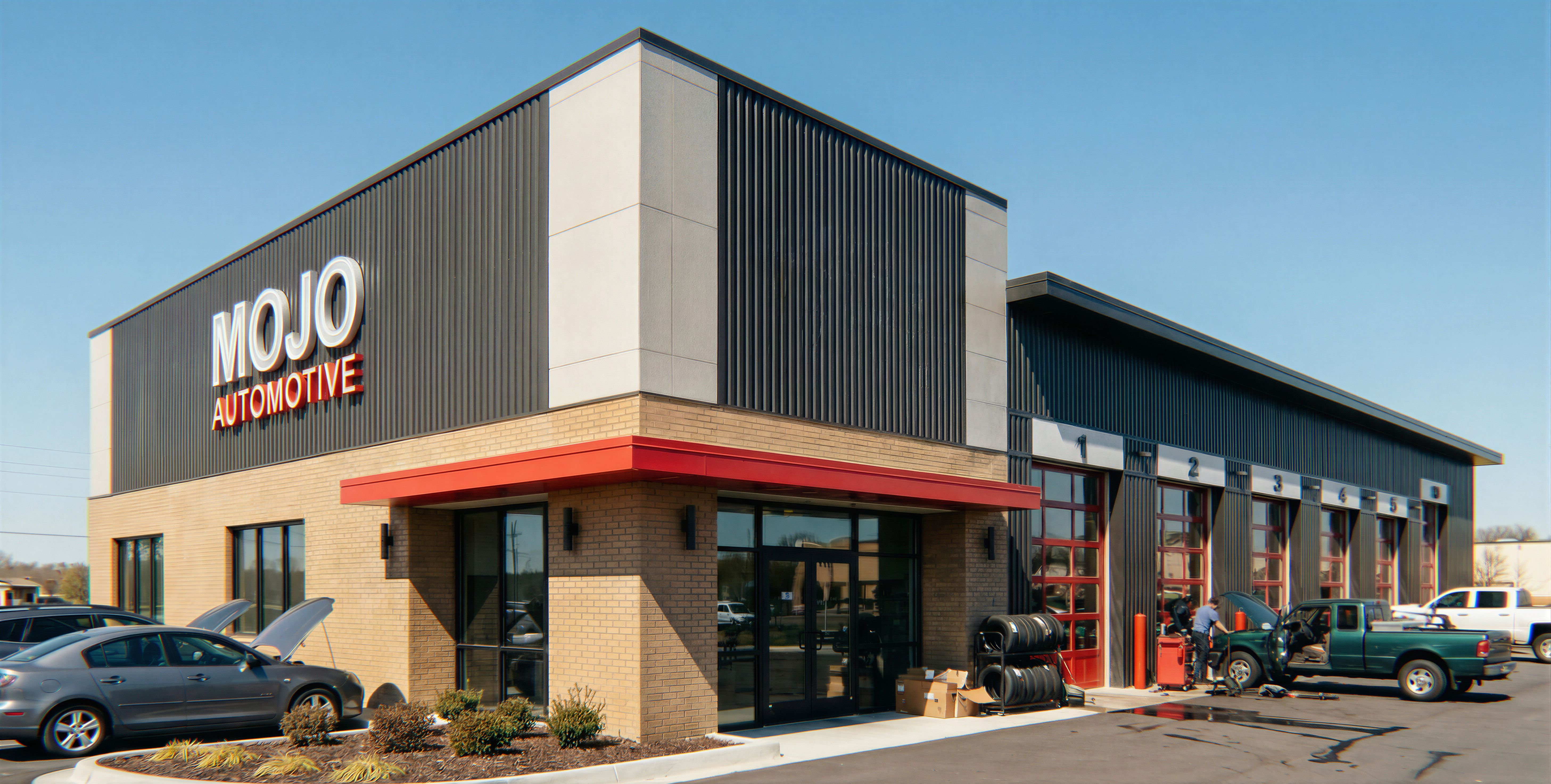 Promptmove logo to left facade and make it twice as big, DO NOT change anything else about this image, keep exact camera angle