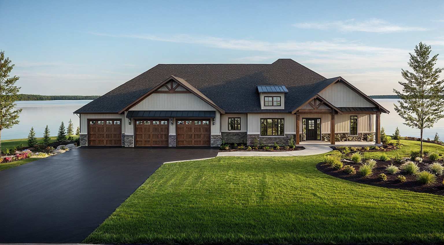 add greenery, landscaping, grass front yard and tress, flower beds, paved driveway to the left as shown, add a lake background off in the distance, only have garage door windows at the top, leave the covered porch alone far right