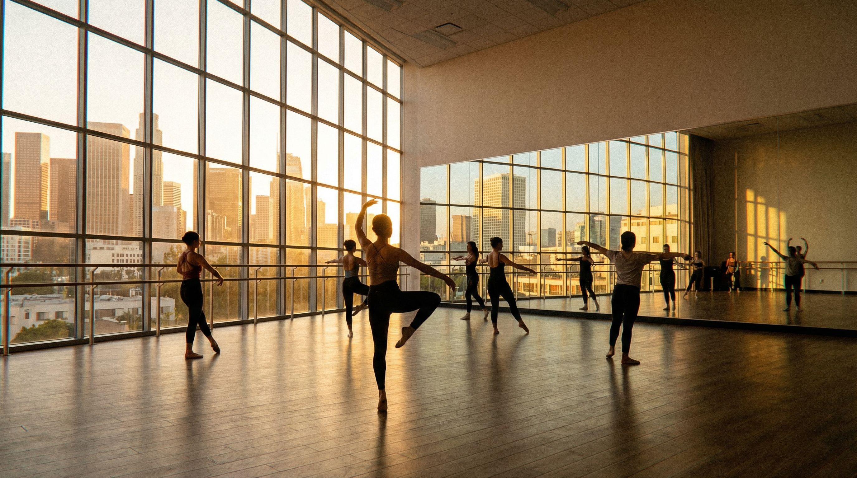 Create a modern dance studio with ceramic wood flooring. Keep the storefront curtain wall. Add a big mirror. From the window, add a nice view of downtown Los Angeles