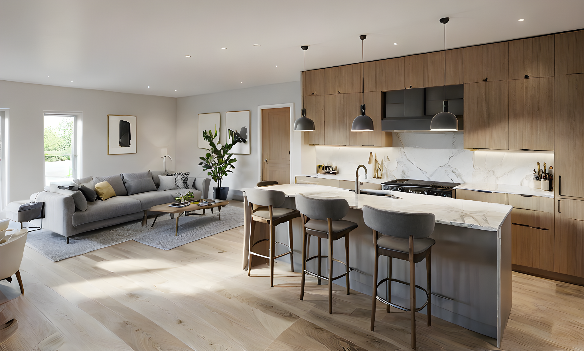 Promptwhite walls, wood floors, scandinavian, grey walls, lighting, modern rug, wood cabinets, marble counter