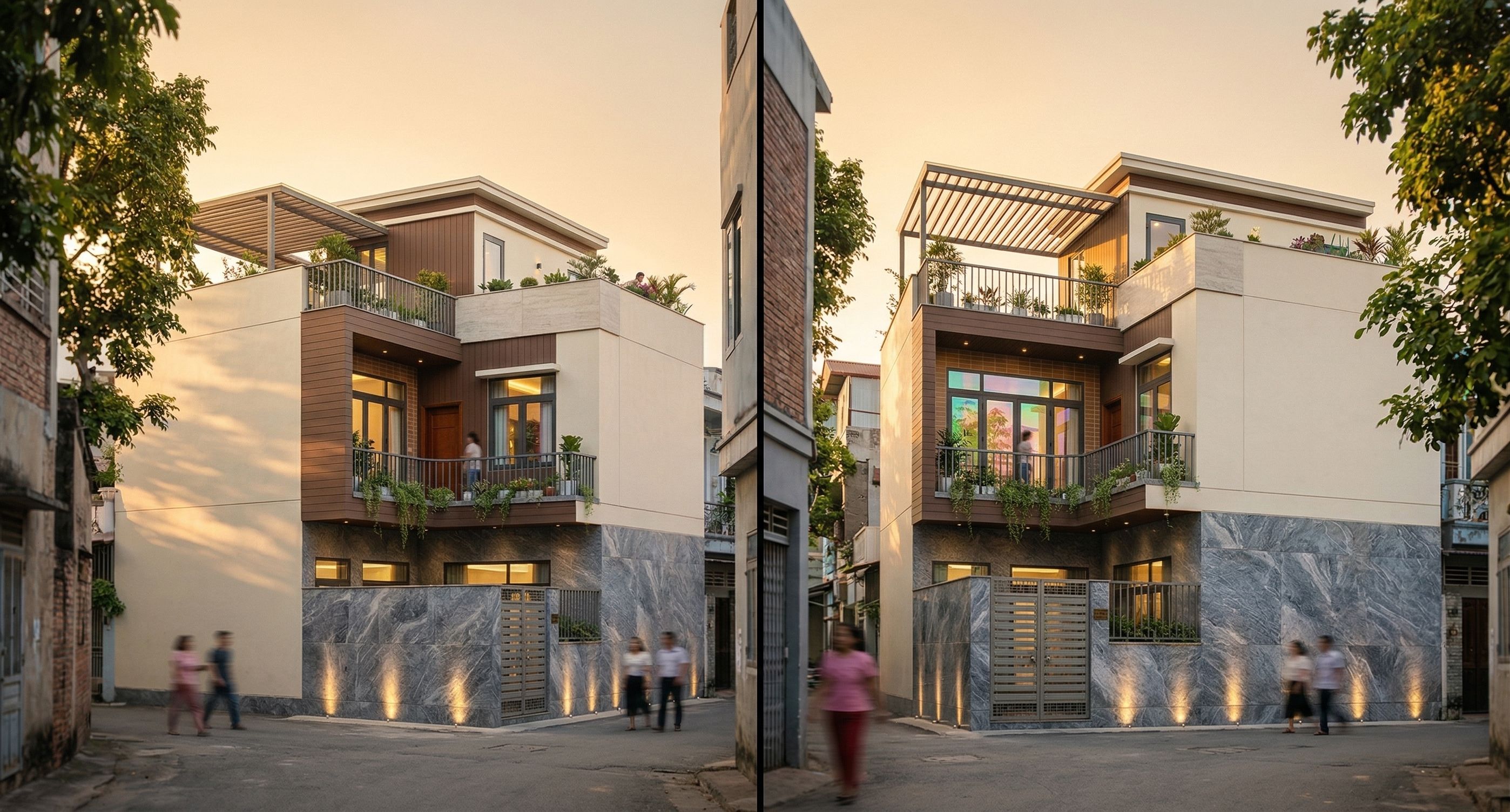 PromptThis photograph captures a modern three-story building with large glass windows and gray iron railings on the balconies of each floor, combined with potted plants to create a cool and inviting garden feel. The lower part of the roof is clad in dark brown wood-plastic composite. The clean lines, smooth white facade, and the contrast between the cream-gray natural stone on the balcony railings and the black painted iron railings are emphasized. Light from the glass windows shines in from within, creating surreal reflections of the surrounding environment. The entire first floor is clad in gray natural stone with veins, highlighted by the light shining from below. Small potted plants and people are placed on the balconies on each floor to add vibrancy. The lower part of the balconies is clad in wood-plastic composite. Located in a small alley in a densely populated residential area with neighboring buildings, the building still maintains a sense of spaciousness. Warm afternoon sunlight casts soft shadows on the walls and pergolas. The overall design structure remains unchanged, clearly showing the brown tile cladding at the entrance to the second-floor balcony. Using a low-angle shot, preserving the existing perspective, and employing a wide-angle lens helps emphasize the height and scale of the building, adding depth to the scene., keep exact camera angle