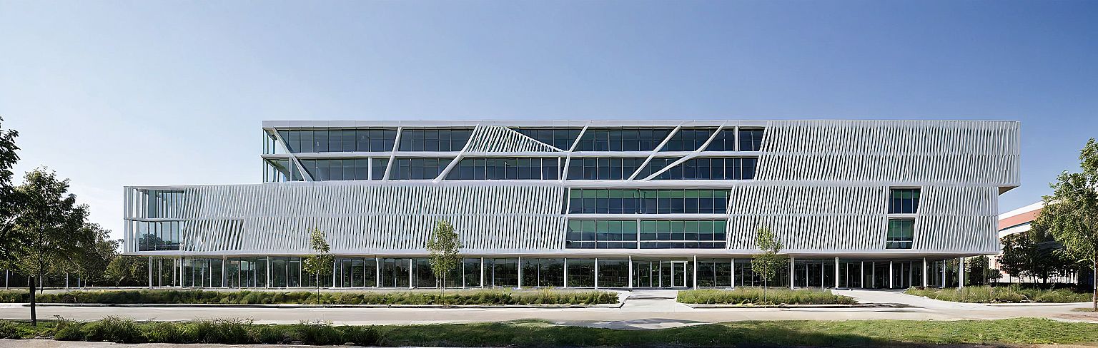 PromptAn eye-level, photorealistic architectural render of a university's architecture department. The building's facade is a study in layers: a primary structure in stark, matte white is overlaid with a sophisticated facade skin. The most prominent feature is a series of vertical, parametrically twisted louvers made of powder-coated aluminum, which control sunlight. These louvers cast intricate, shifting shadows across the large, floor-to-ceiling double-glazed windows set deep into the facade. The scene is lit by the clear, bright light of a mid-morning sun, emphasizing the structure's clean lines and sculptural form. It also has green terraces for heat control. And add landscaping around the building