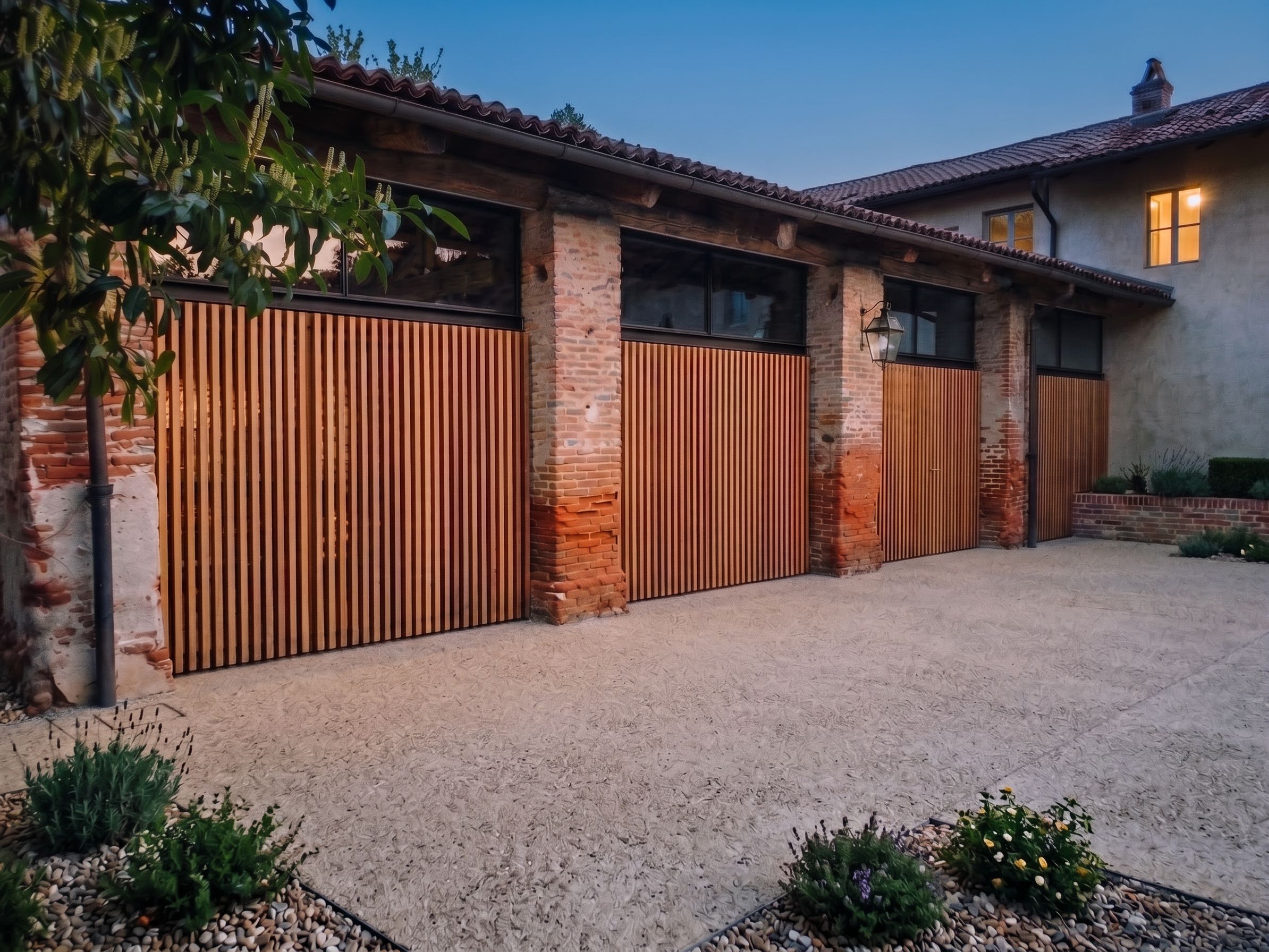 inserisci porta rivestita in listelli anche nella campata intermedia . Invece della pavinentazione in pietra usa pavimentazione in stabilizzato colore chiaro . Eimina fioriera in mattoni . eLIMIna luci nei serramenti . I profili in ferro dei serramenti devono essere molto piccoli , keep exact camera angle