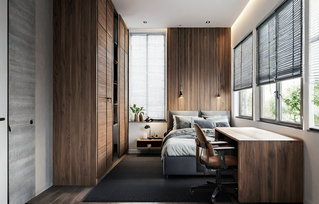 Promptairy and bright modern scandinavian bedroom interior in daylight with walnut cabinet, and dark grey accent. Wood blind window. Black floor tile. with light grey wallpaper
