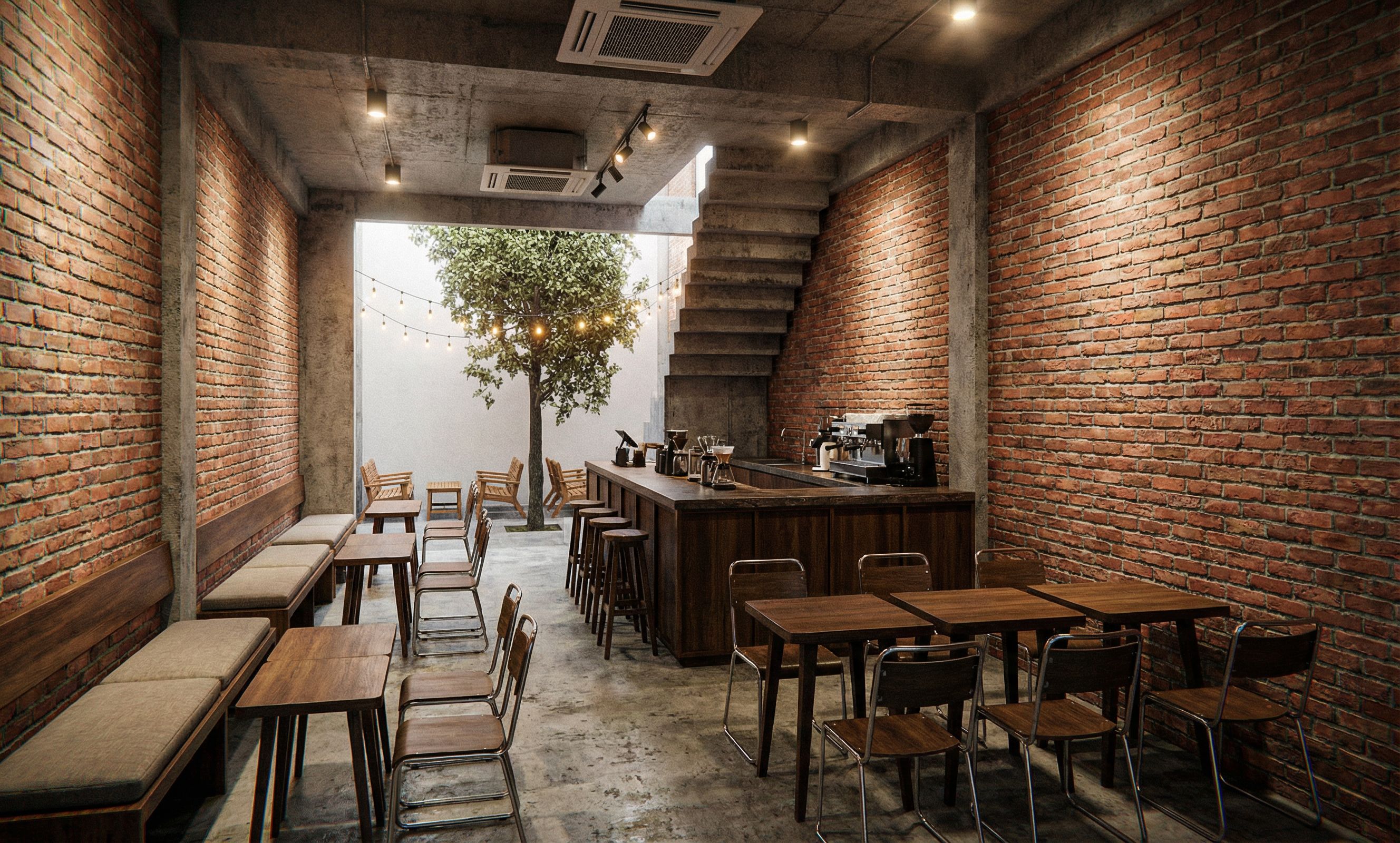 PromptThe cafe is decorated in an industrial style, with exposed concrete ceilings and columns, and unplastered red brick walls revealing the joints. The staircase is also unplastered concrete. Lighting uses neutral-toned spotlight fixtures and surface-mounted lights. A wooden bar with complete brewing equipment is located to the right, under the staircase. Opposite the bar is a long bench seating area. The rest of the space features individual tables and chairs. The rear patio has two sets of outdoor seating. The indoor cafe furniture is compact, with a simple, modern design and a predominantly brown wood tone., keep exact camera angle