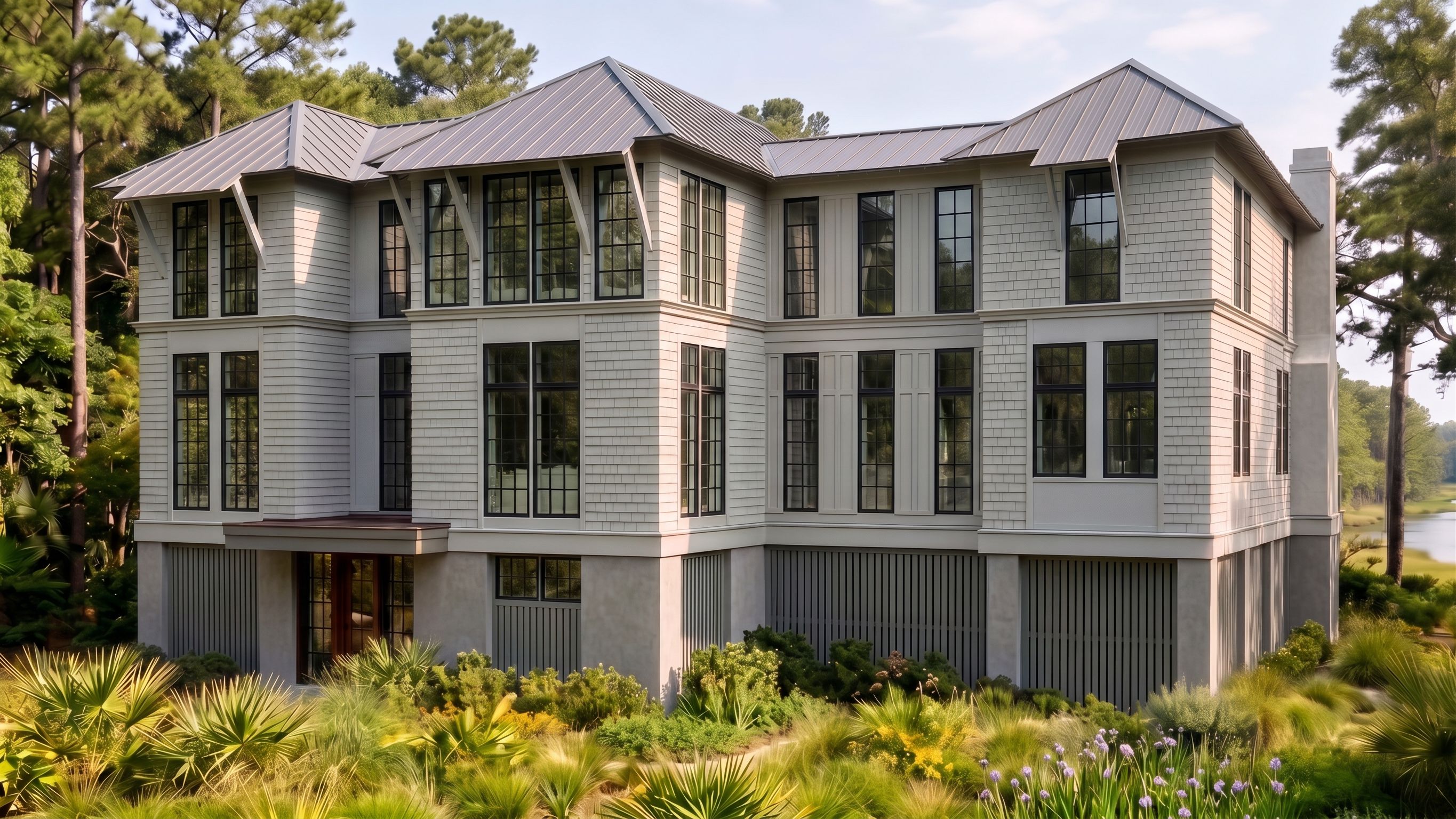 PromptEliminate driveways and garage doors. Substitute vertical wood slats for garage doors. Foundation material is tabby shell stucco and should be a darker gray color to match the aluminum standing seam metal roof. Exterior trim and shingles to be a light gray. Window sashes to be black. Fireplace material is stucco. Remove all paving from the scene. Render the louvered shutters adjacent to the windows the same color as the wall shingles. Building lot is a southern coastal environment. There is a river in the far background that is visible through the trees on the right in the background. No other buidlings are seen in this view. Infill areas shown as walks with plant material used in the foreground of this view. Do not deviate from the uploaded image with extra architectural features. Vertical slats in foundation wall to be the same color as the foundation stucco. Remove shutters added. Please do not add anything extra. Remove the shutters added. Please do not deviate from the original image for exteriors. River in background should flow from left to right in the distance. Do not add any extra exterior elements not included in the previous or original images. Remove shutters. Remove exterior stair Chimney is too tall. Shorten. Remove white stipple from foundation. Remove shutters and exterior stair off porch at the right rear. River is in wrong position. Put further in the background on the horizon Lighten foundation color a little