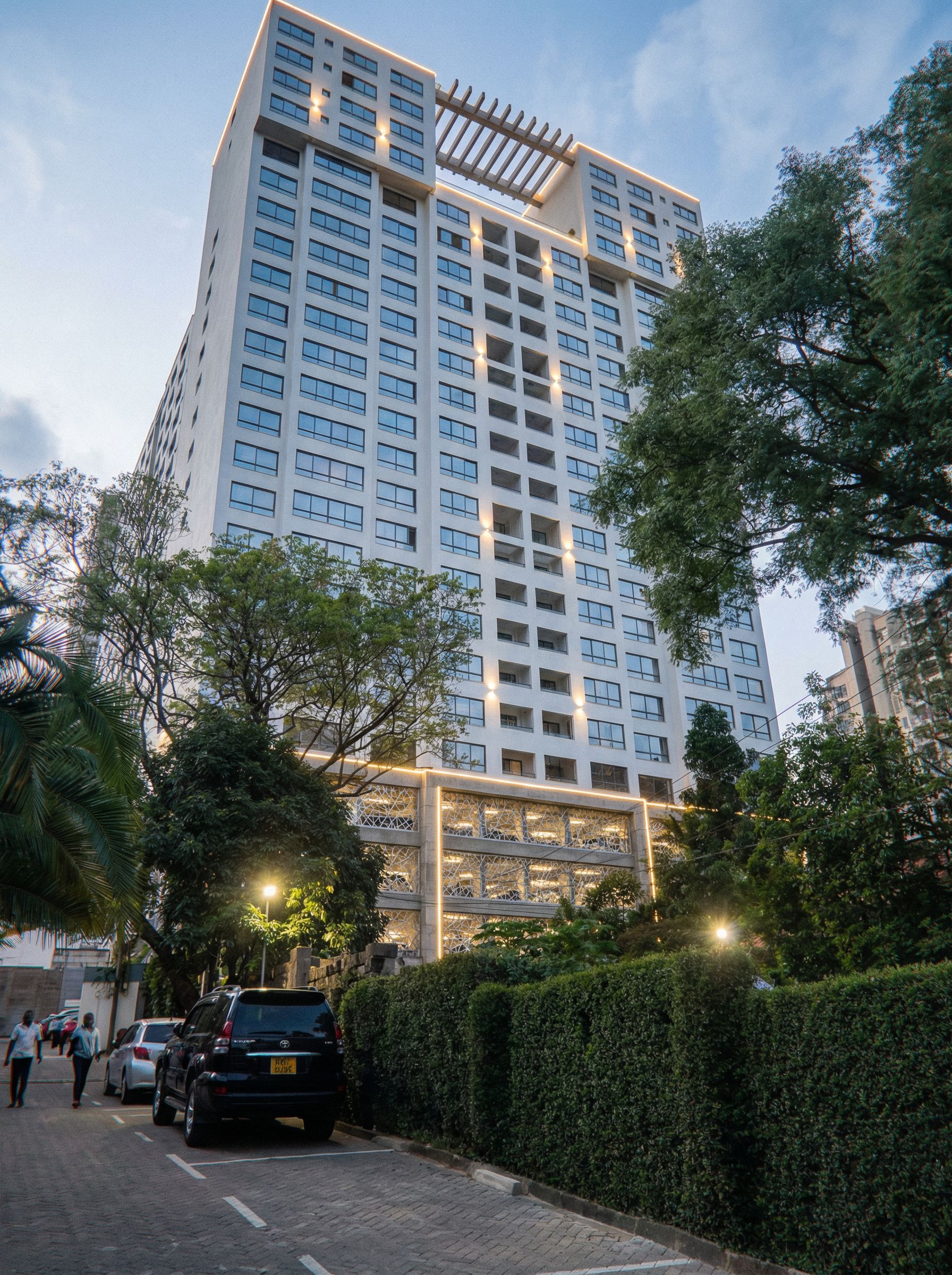 PromptRENDER OF A BUILDING IN MUTHAIGA AREA IN KENYA. USE WHITE WALL MASTER ON THE BUILDING. MAKE THE GLASS CLEAR, TRANSPARENT AND REALISTIC. INCREASE THE THE HEIGHT TWO SIDES BY ONE FLOOR AS INDICATED WITH THE RED FILL. CONNECT THE TWO RESULTANT TOWERS BY A CONCRETE PERGOLLA PROJECTING SLIGHTLY OUTWARDS ON THE ROOF AS SHOWN WITHN THE BLACK LINES. THE FIRST 4 LEVELS ARE PARKING LEVELS COVERED WITH ALUMINIUM LATTICE WORK FRAMED BY CONCRETE BEAM. Use rope lights, spot lights and street lights on the building., keep exact camera angle
