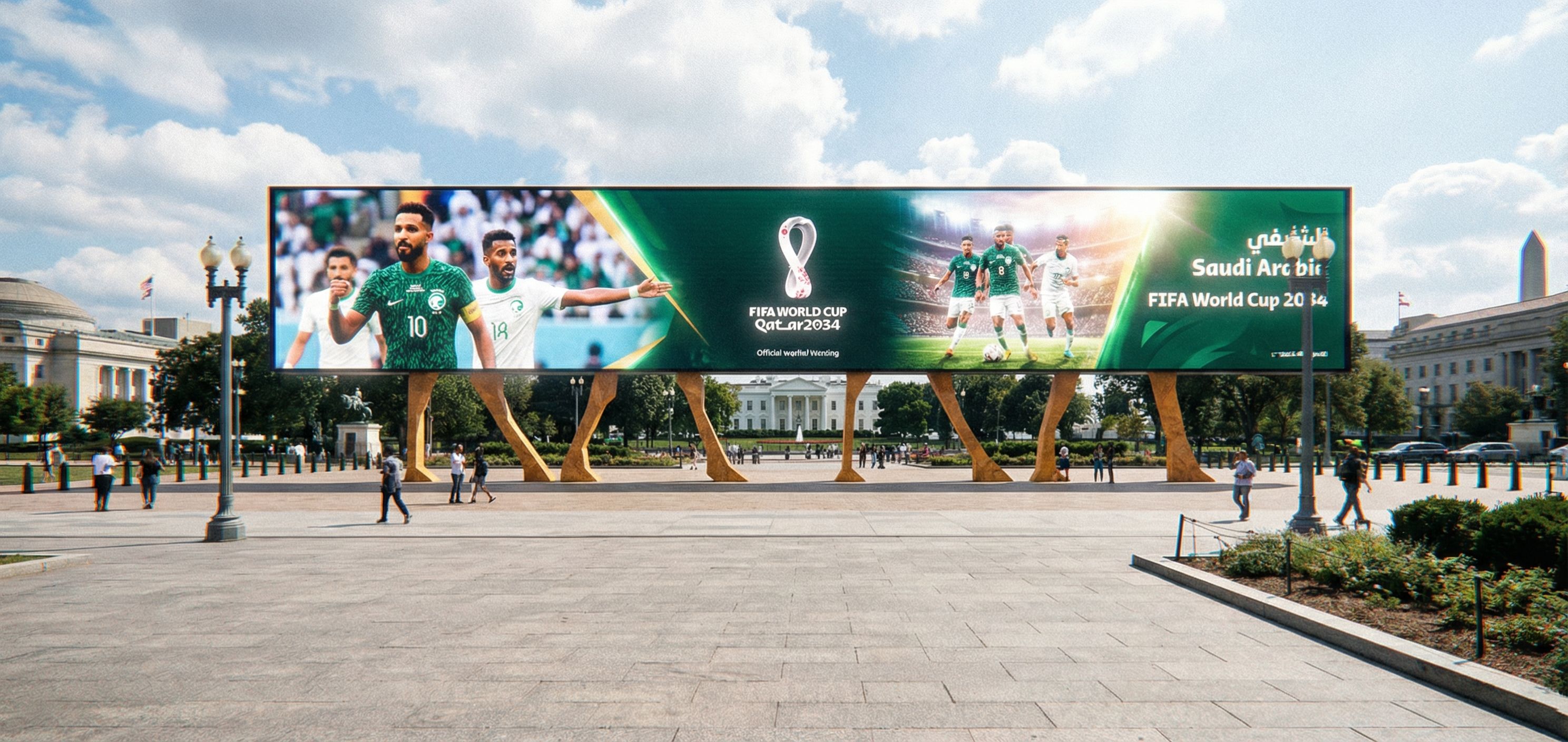keep exact camera angle , BLACK IS SCREEN , YELLOW IS Riyadh stone , Washington DC , PUT Saudi Arabia FIFA World Cup 2034 ads ON SCREEN,, keep exact camera angle