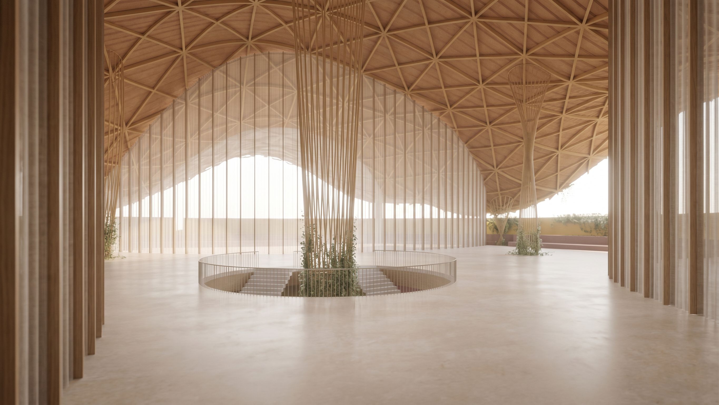 PromptTransform this raw Rhino interior into a soft, dreamy, blurred atmospheric architectural render while strictly preserving the exact geometry, composition, proportions, camera angle, roof form, column placement, curtain locations, atrium opening, and all architectural elements exactly as modeled.