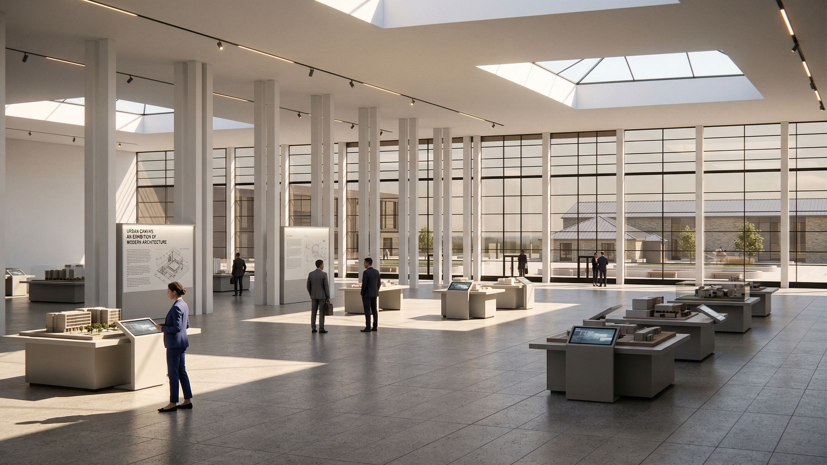 PromptA photograph of an exhibition space in a modern industrial and office complex. A minimalist, contemporary interior with exhibition galleries and special lighting. An architectural exhibition. Elegant tinted glass windows and light-colored walls. Tinted glass skylights on the ceiling allow bright rays of sunlight to enter the space. People in business suits move through the exhibition. Warm daylight casts soft shadows. Shot from a person's perspective. Maintain the exact camera angle., keep exact camera angle