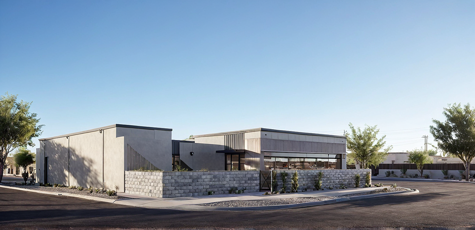 Architectural visualization of a hair salon's shopfront in Phoenix, Arizona, clear sunny sky mood, low planting shrubs, historic neighborhood, smooth concrete walkway.