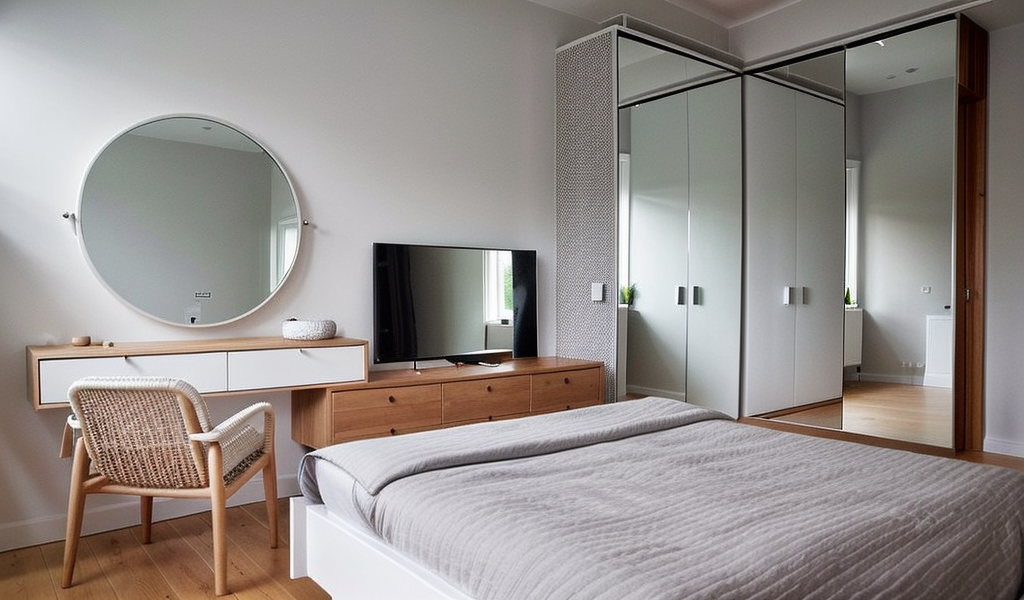 PromptModern interior. Maple and white materials. Wooden floors. Light grey textile chair. Mirror wardrobe. Clean white paint walls. Circular mirror on wall. Light grey bed.