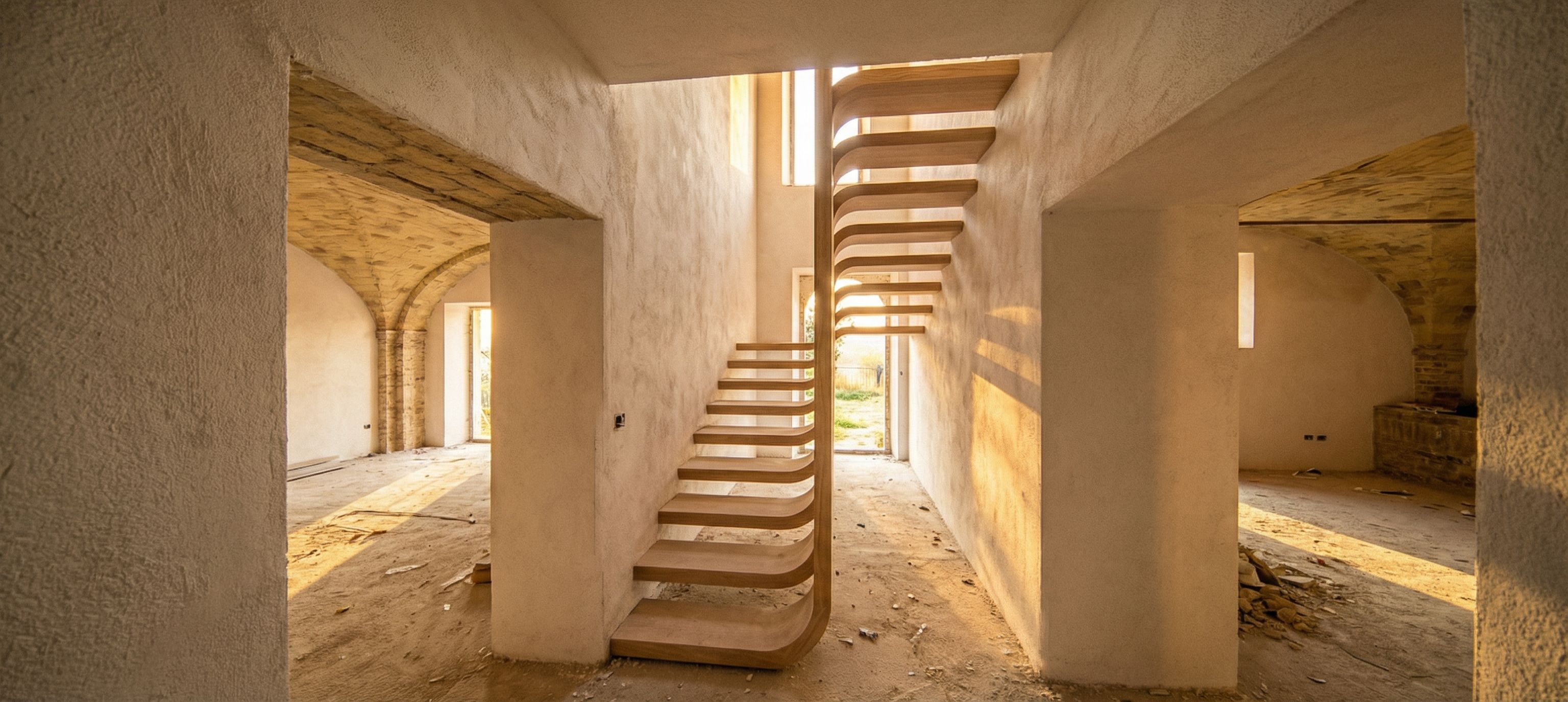 PromptCreate a realistic image. Use the materials shown in the reference image. 1 Use the light wood for the steps of the staircase shown in the uploaded base image., keep exact camera angle