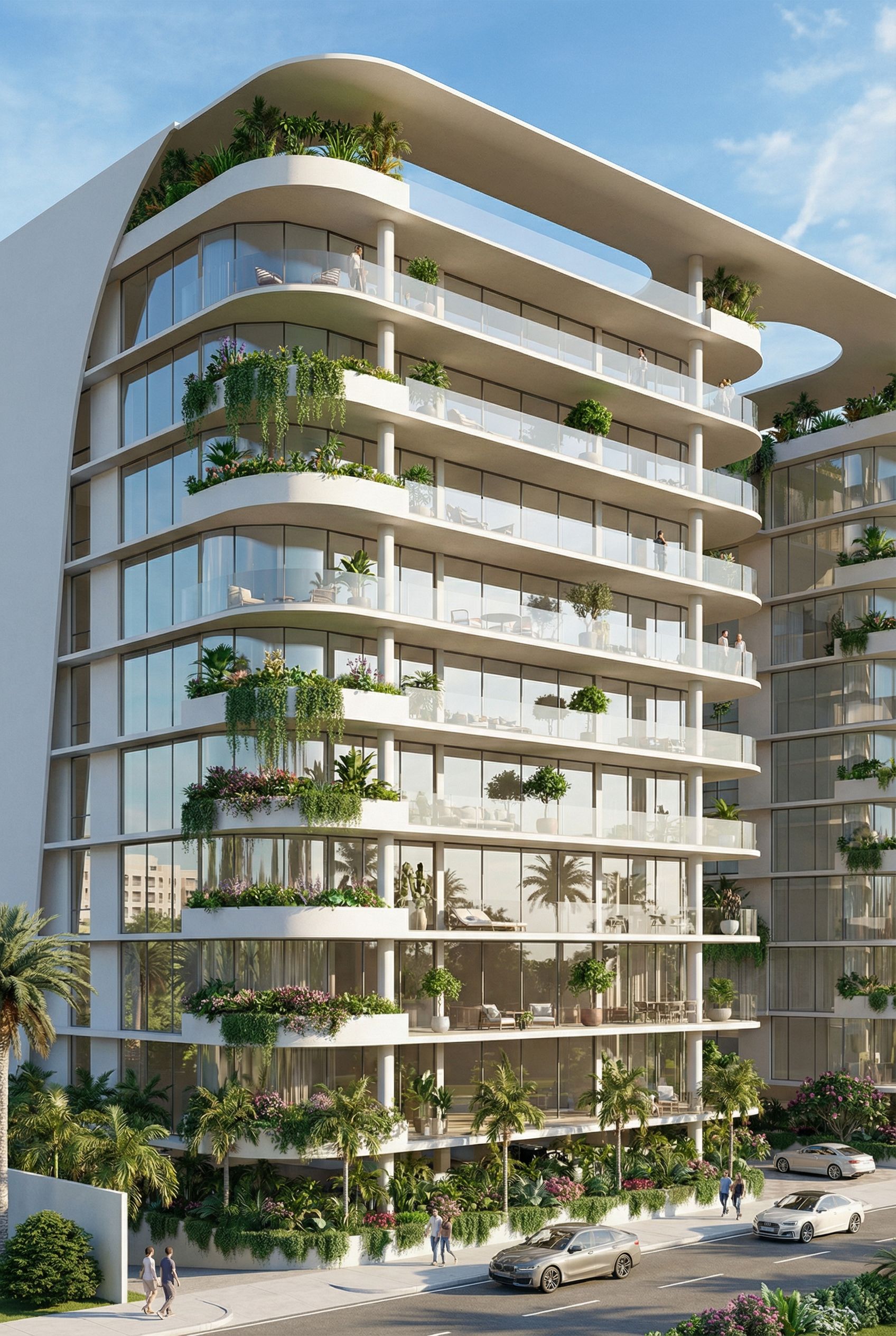 Promptarchitectural exterior rendering, render this photo into photorealistic rendering, Keep the structure and form of the model, but with the render style of the reference image. Photo of a modern residential building featuring sleek, curved balconies and abundant greenery. Architectural design elements include floor-to-ceiling glass windows and smooth concrete surfaces, reflecting contemporary aesthetics. Situated in an urban landscape with palm trees in the foreground, and nearby structures visible in the background. Soft, natural lighting from a clear day enhances reflections on the glass. Captured from a low angle, with a wide lens that emphasizes the building’s height and unique silhouettes, creating a compelling sense of depth and space. Include decorative elements on the balcony, like plants and furniture ., keep exact camera angle, bright daylight, natural lighting, including people, vehicles, greenery and vegetation, trees, high quality, professional, detailed scene