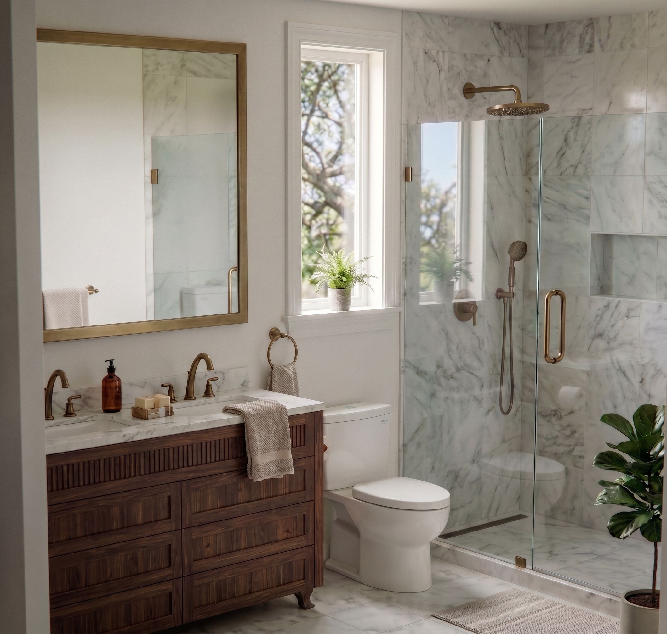 PromptREMOVE THE SHOWER FAUCETS REFLECTION IN THE MIRROR, ADD WHITE WINDOW TRIM, keep exact camera angle