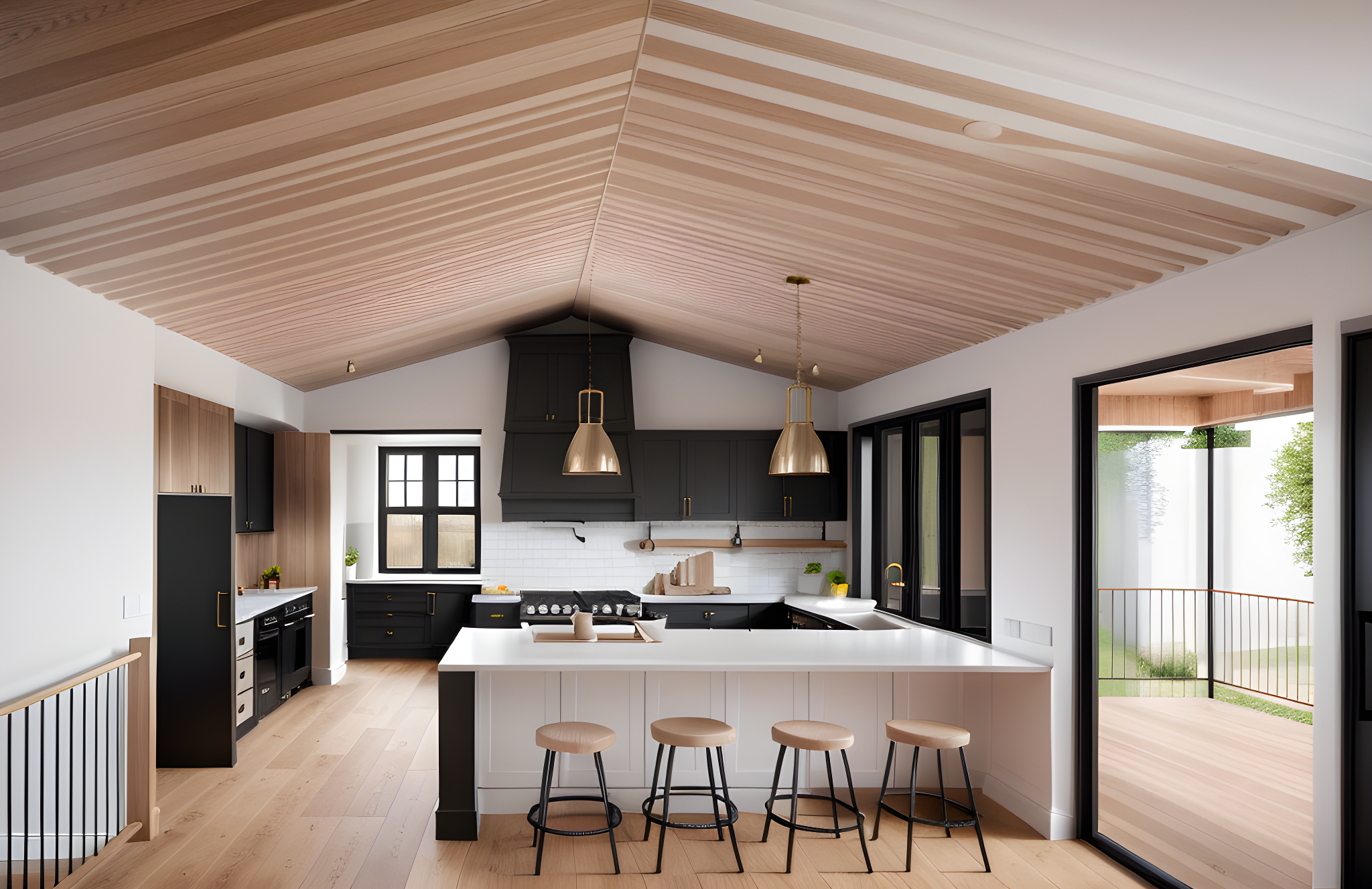 PromptSketch of a modern farmhouse style kitchen with matt black island cabinetry, white subway splash back tiles, oak timber flooring, brushed brass tapware, white stone benchtops