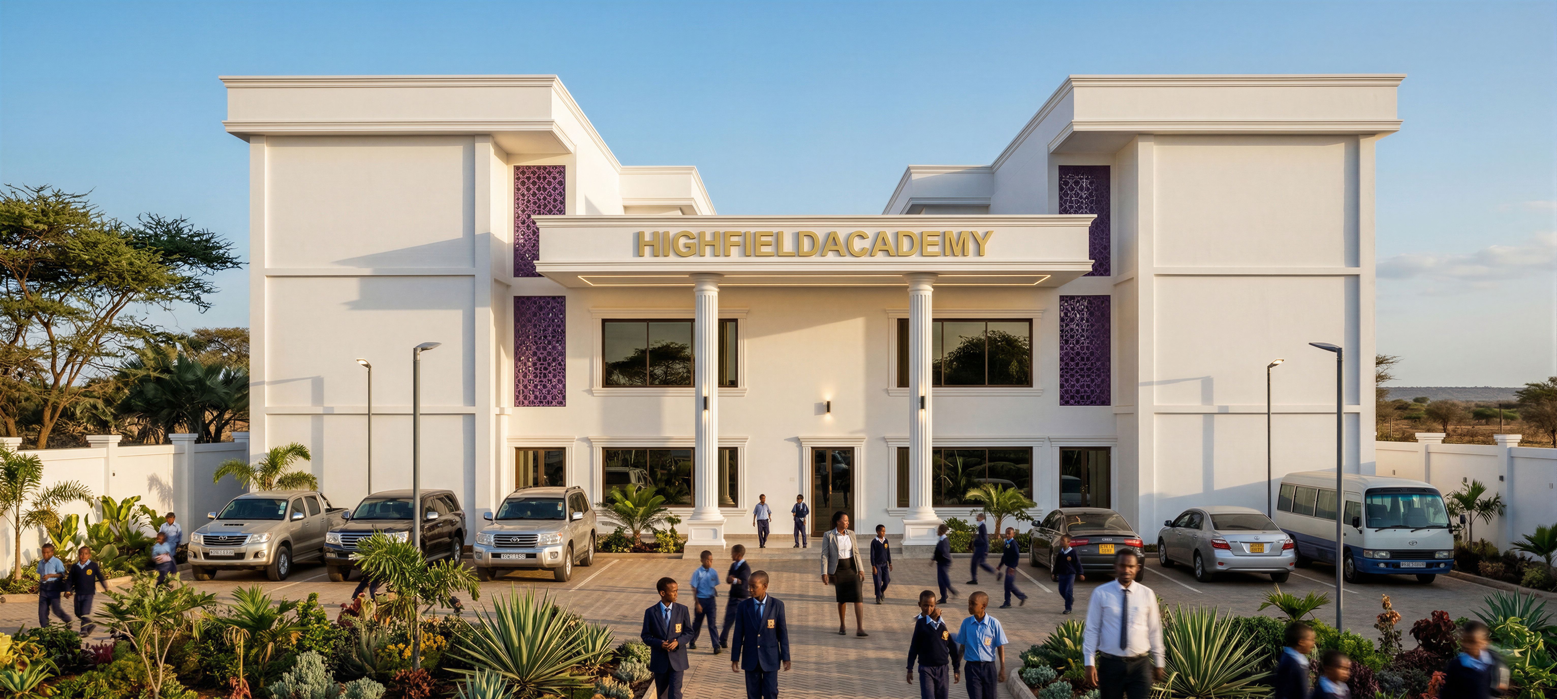 RENDER OF A SCHOOL IN GARRISSA COUNTY IN KENYA. MAKE THE GLASS REALISTIC AND REFLECTIVE. INCLUDE MOULDINGS ON OPENINGS AND WINDOWS. MAKE THE TWO ROUND COLUMNS CLASSICAL IN DESIGN. INCLUDE STREET LIGHTS AND SPOT LIGHTS IN THE BUILDING. INCLUDE CHILDREN OF SOMALI ORIGIN IN SCHOOL UNIFORM. INCLUDE TEACHERS OF AFRICAN AND SOMALI ORIGIN. USE BRILLIANT WHITE WALL MASTER ON BUILDING AND SURROUNDING BOUNDARY WALL. THE NAME AT THE FRONT ON THE BUILDING SHOULD BE "HIGHFIELD ACADEMY" CLEARLY SHOW SOME LANDSCAPING AT THE FRONT ., keep exact camera angle